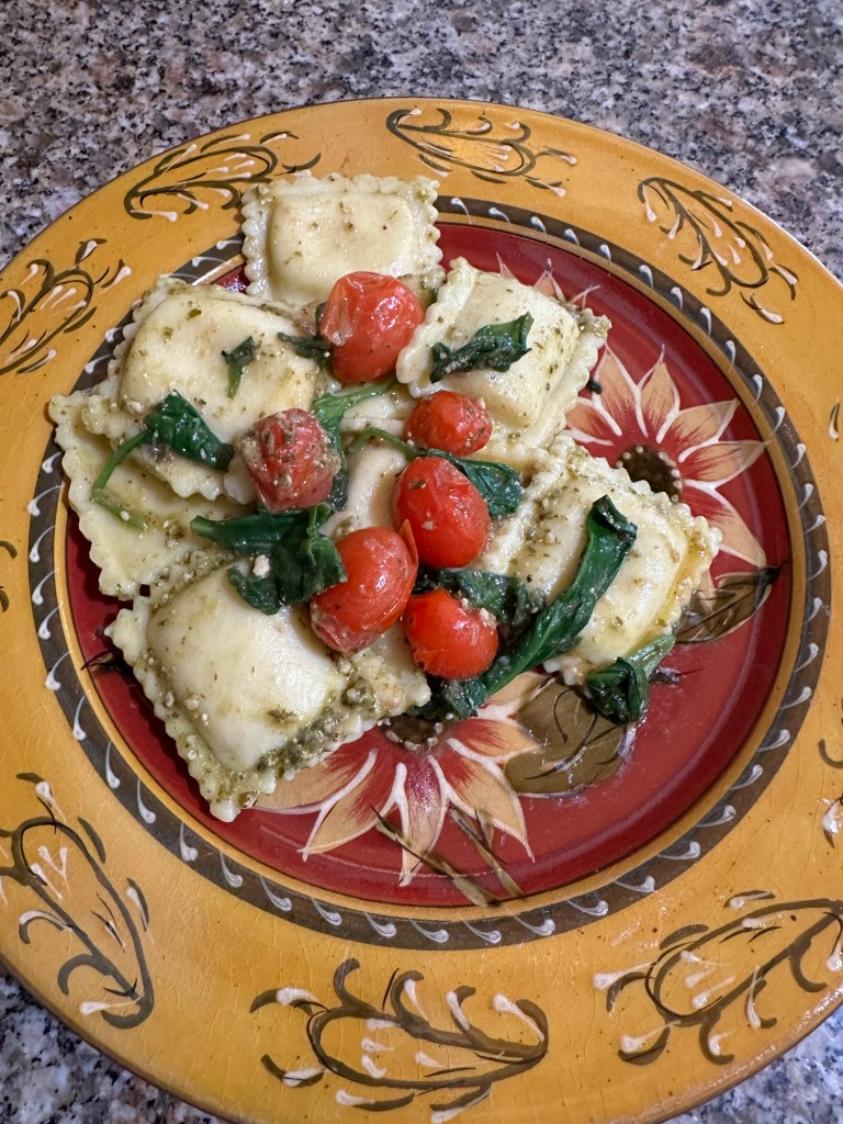 I tried a new recipe last night, though, where I won’t change a single thing. This pesto-flavored ravioli dish is quick, simple, elegant, and delicious. It’s from Eating Well, and it’s perfect!
