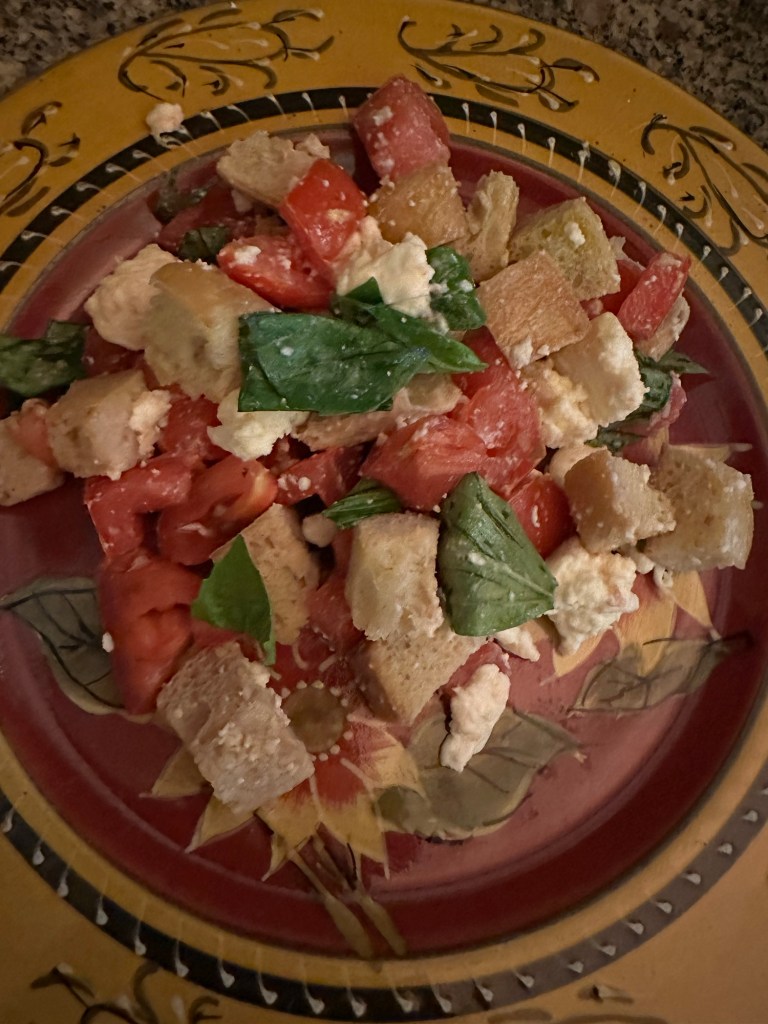 I’m including the recipe as written, but I really just used it as a guideline. I didn’t weigh the tomatoes. I’m still not using onions until Ken’s GERD calms down. I left out the parsley, and the amount of basil was determined by how much was in the package I bought at the store. (I haven’t been able to grow basil for the past few years, because downy mildew takes it out every time. And we put our Aerogarden indoor hydroponic garden away a few months ago because it was attracting insects). In place of the cream, I used half-and-half, because we usually have that on hand for coffee, and it worked just fine. I only drizzled a little of the sherry vinegar; salting the tomatoes, as the recipe calls for, makes them so flavorful that you don’t need much dressing. But do use the best, most flavorful olive oil you have. I used ciabatta rolls for the bread, since I had leftovers from making paninis the night before.