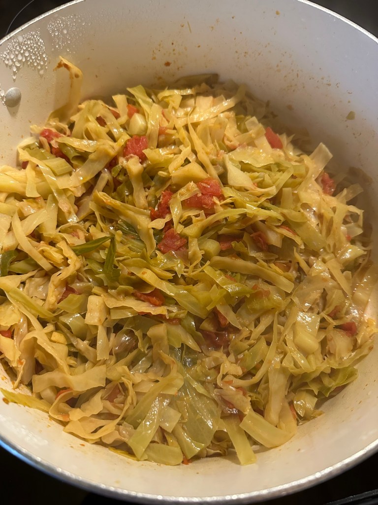Add ginger, tomatoes, and chili or red pepper, and continue cooking for an additional 5 minutes. Add 1 teaspoon salt and 1 cup of hot water. Reduce heat to medium-low and cook the cabbage, covered, until it is tender and the liquid is absorbed, about 30 minutes. Fold in cilantro and check for salt. This dish can be served immediately, but it won’t hurt if you make it a bit ahead of time and let it simmer on low heat. Just stir and check occasionally, to make sure it doesn’t burn. It can also be made several hours ahead and reheated before serving.