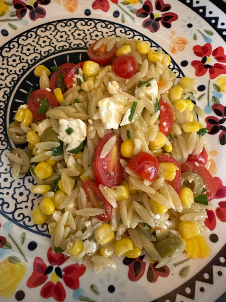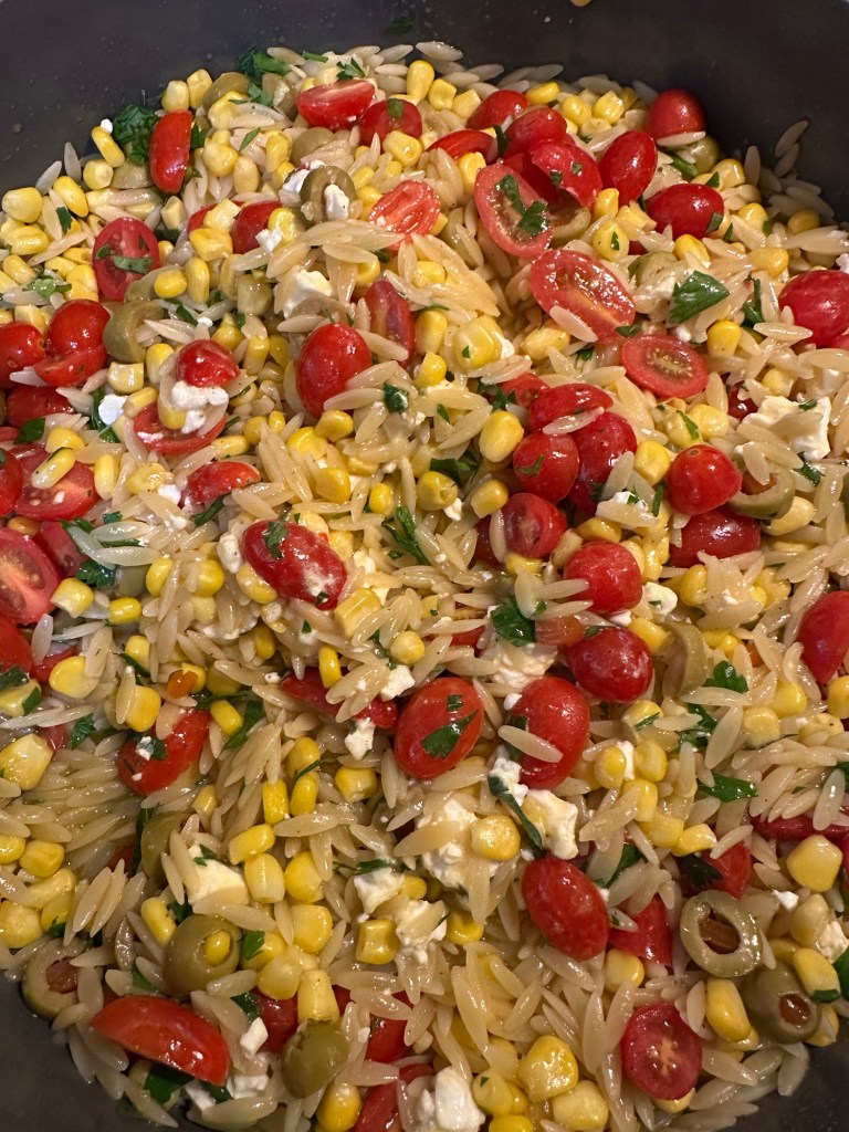 I cooked a new recipe by WaPo’s Aaron Hutcherson last week, skillet orzo with corn, tomatoes, and feta. I’ve been a skeptic of skillet pasta dishes. Somehow, it seemed sacrilegious to not cook the pasta separately. But I’m finding that it works, it streamlines the cooking process, and simplifies cleanup. What’s not to like?
