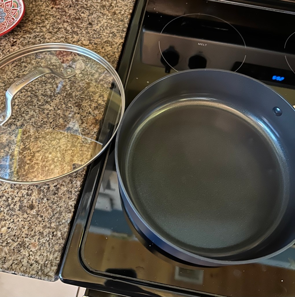 Sometimes that resolve runs into reality. There are some things, particularly in the kitchen, that have needed downsizing. I don’t need a five-quart Dutch oven for the two of us. The cute 2-quart one that I got a couple of months ago serves us just fine. And I made an executive decision last week that we needed a smaller sautée pan. And although I did keep my large sauté pan, I pitched an older pan that I hadn’t used in at least a year. So tonight was the first time I used the new pan.