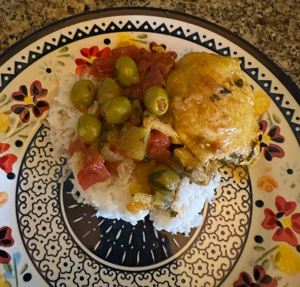 These days, my recipe is based on the one in The Frugal Gourmet Cooks Our Immigrant Ancestors, which is, in turn, influenced by the version in Paula Wolfert’s Couscous and Other Foods of Morocco. That’s one of those cookbooks that is a joy to simply sit and read. Most of the time, the olives I include are pimento-stuffed manzanilla olives, simply because they are readily available. I don’t think they’re authentic, but they taste wonderful in the dish. Ken always asks me to add extra. My version has more sauce than some, because we love the accompanying rice soaked in sauce. I don’t completely drain the liquid from the canned tomatoes. Any combination of bone-in chicken pieces will work. Tonight I cooked two thighs and one large breast half that I cut into two pieces.