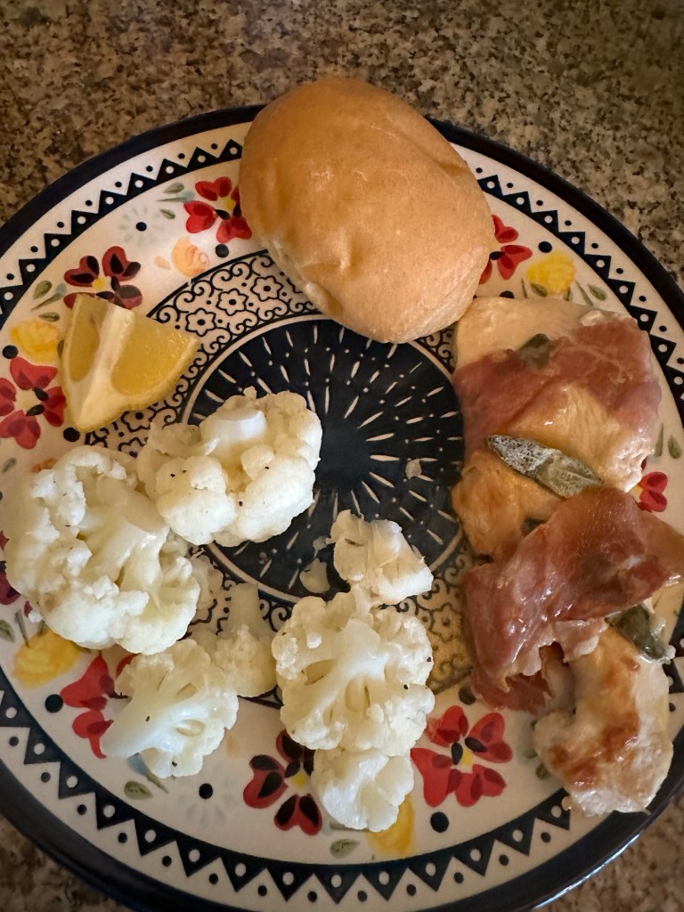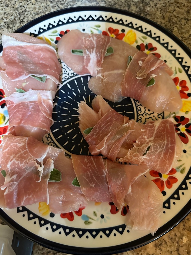Today’s recipe is one that I made last weekend, chicken saltimbocca. This is one of my favorite recipes, probably because of my love of prosciutto. When it’s in the house, our favorite way to eat prosciutto is with chunks of cantaloupe, but I try to make sure we leave enough for this dish. The recipe is from Cooking Light, one of my favorite sources for healthy recipes. It’s easy and elegant; I’ve made this for guests.