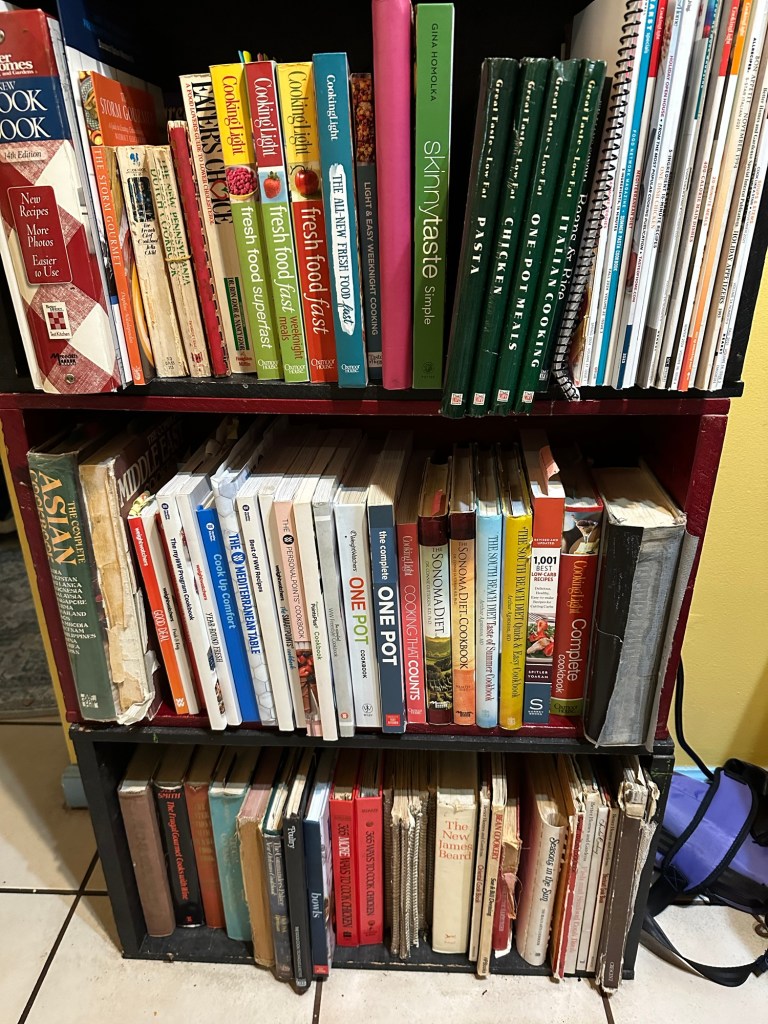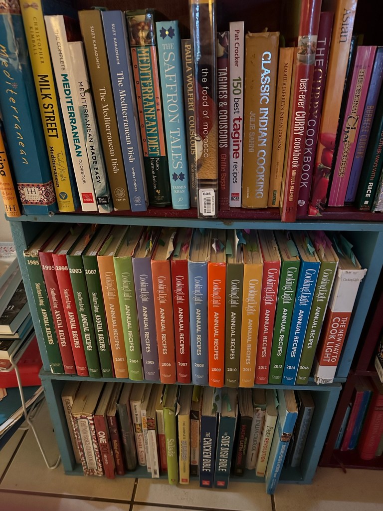 I have cookbooks in two bookshelves. One set is next to our desk, adjacent to the kitchen. The other bookcase is in the family room. I can actually sit in my usual chair and reach over to those shelves. Now, all of the Mediterranean cookbooks are together on one shelf, along with other ethnic cookbooks grouped by region. All of the annual compilations of Cooking Light that I own are together. Most of my more general cookbooks are in the bookcase near the kitchen. The organization system may not be intuitive to someone else, but I think it’s going to work for me.