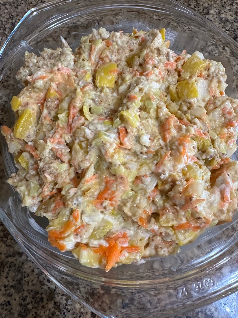 Over the years, I’ve tweaked it a bit. The recipe shows its age by including a can of condensed cream of chicken soup. I still include it, but use the reduced fat version. Likewise, I use reduced fat sour cream instead of regular. Because those changes result in a runnier consistency, I’ve adjusted the amounts of veggies and stuffing mix. My choice for stuffing mix is the Pepperidge Farms herb-seasoned mix. I once made a vegetarian version by substituting cream of celery soup. I suppose you could use cream of mushroom soup, but I think that would change the flavor profile. This tastes the way I remember it.