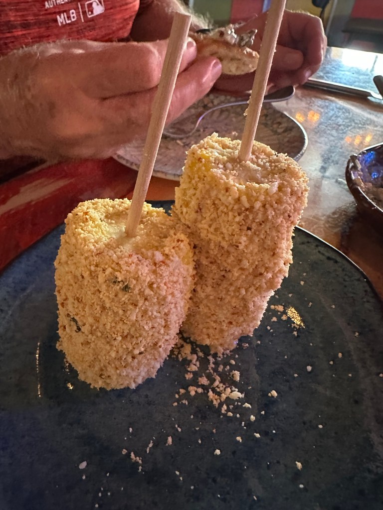 The previous day, on our way to Disney, we stopped on International Drive in Orlando. This is an area that caters primarily to tourists, with attractions, hotels, and restaurants. While the restaurants are predominantly chains, there is an independent gem that is one of our favorites: Cafe Tu Tu Tango. Also an art gallery that provides work space for artists, their small plate menu is varied and creative. We usually share three plates when we visit for lunch. So we started with the best spinach dip I’ve ever tasted. It was served cold and included feta and roasted red peppers—not an artichoke in sight. We dove into it with the accompanying pita and lavash so quickly that I forgot to take a picture. But I remembered in time to get a shot of our second plate, their take on Mexican street corn, which included lime mayo, cotija cheese, and tajin. It was my introduction to tajin, a chili-lime seasoning mix, and it was delicious.