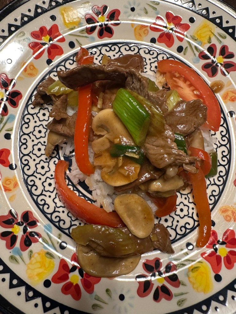 After a busy day and a filling lunch, I was glad that we’d planned an easy dinner. Nothing beats a stir fry when it comes to ease of cooking. I made one that comes from the first Asian cookbook I ever owned, a slim Better Homes and Gardens Oriental cookbook that I think I got about the same time as my first wok, in the 1970s. Its main ingredients are beef and fresh tomatoes, but other veggies, too, and I tend to add whatever I have on hand. It turned out really well tonight.