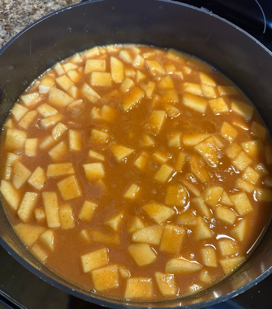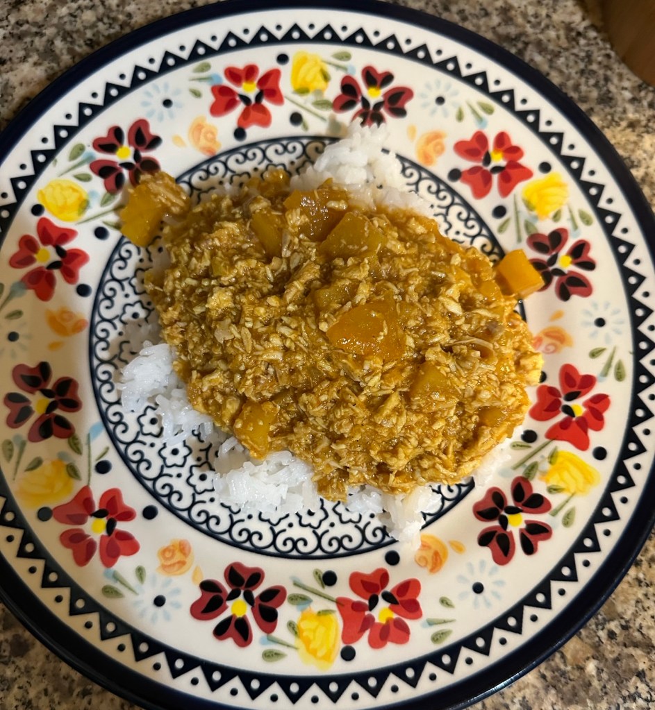 The recipe calls for diced cooked turkey, but I throw the meat into my food processor and coarsely shred it. My choice of curry powder for this dish is Penzey’s sweet curry powder. Curry powders vary so much and changing which you use can change the final taste. I currently have five curry powders in my collection: three from Penzey’s, the sweet, Maharajah, and “now curry, plus a French blend that was a gift from our son, and a Jamaican curry powder that we use in Caribbean cuisine. I will sometimes make cranberry chutney for Thanksgiving, but I didn’t this year. That was unfortunate, because the chutney is just perfect with this. But I didn’t have a commercial peach chutney that was a nice accompaniment.