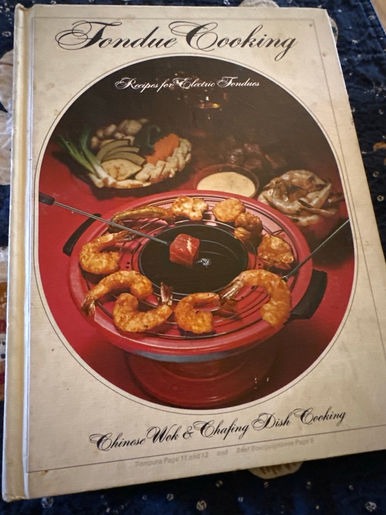 Over the years, we’ve gotten rid of the fondue pots. We never used more than one at a time, anyway, and I can’t remember the last time we made a fondue. The last one went out in the garbage about six months ago. Somewhere along the way, I either gave away or discarded one of the cookbooks, too.