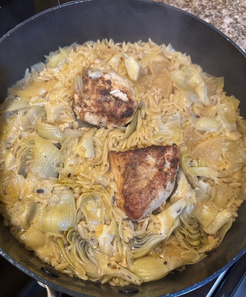 This week started out as usual. I had a favorite chicken and rice dish planned for Thursday. Then, at breakfast Wednesday morning, Ken looked up from reading the Washington Post on his tablet and said, “have you seen this recipe for chicken with preserved lemon and orzo?” I quickly started scrolling, because he added, “it’s got artichokes.” This sounded like it had all the ingredients for a real winner. Suddenly, we’d chucked Thursday’s original plan in favor of the new recipe.