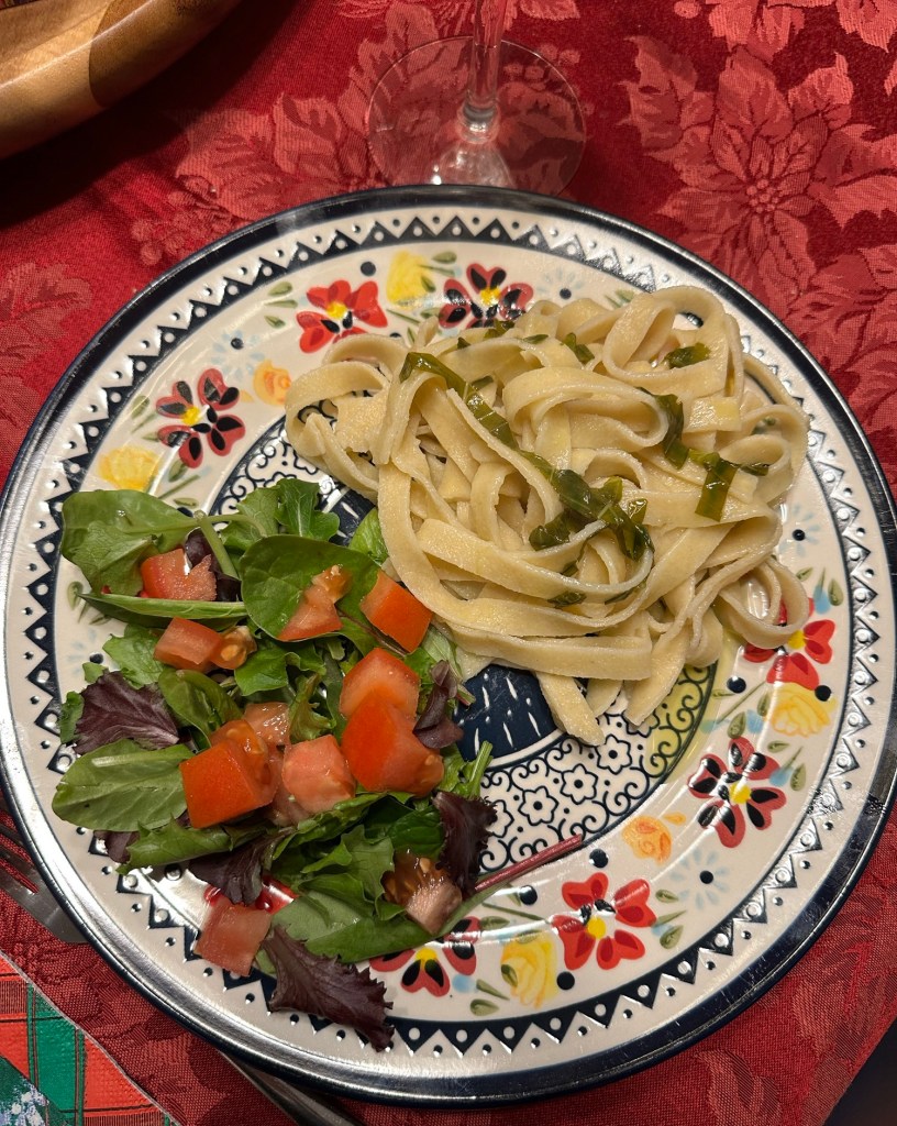 I think we all have go-to emergency meals: dinners that can be thrown together with pantry/fridge/freezer staples. For us, that usually involves pasta, and that was the case this time, too. But, to raise the level of tonight’s dinner, I used a package of artisanal roasted garlic fettuccini that I had been given for my birthday. The aroma of roasted garlic was really noticeable, so I didn’t want to drown it in marinara. Instead, I heated a good, fragrant olive oil, then added lemon juice and fresh basil. Simple, and so good! It was a reminder that you don’t always need a long list of ingredients or a complicated process to create a delicious meal. I added a salad of baby greens and tomatoes, dressed with good olive oil and a Meyer lemon-infused white balsamic vinegar. Yum!