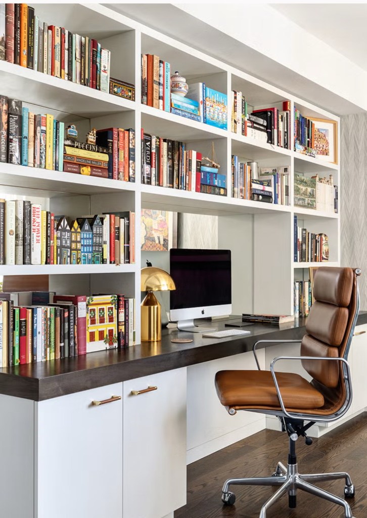 My ideal space would have a desk with plenty of room to spread out whatever I’m working on, lots of storage, and, of course, a comfortable, ergonomic office chair. This looks ideal.
