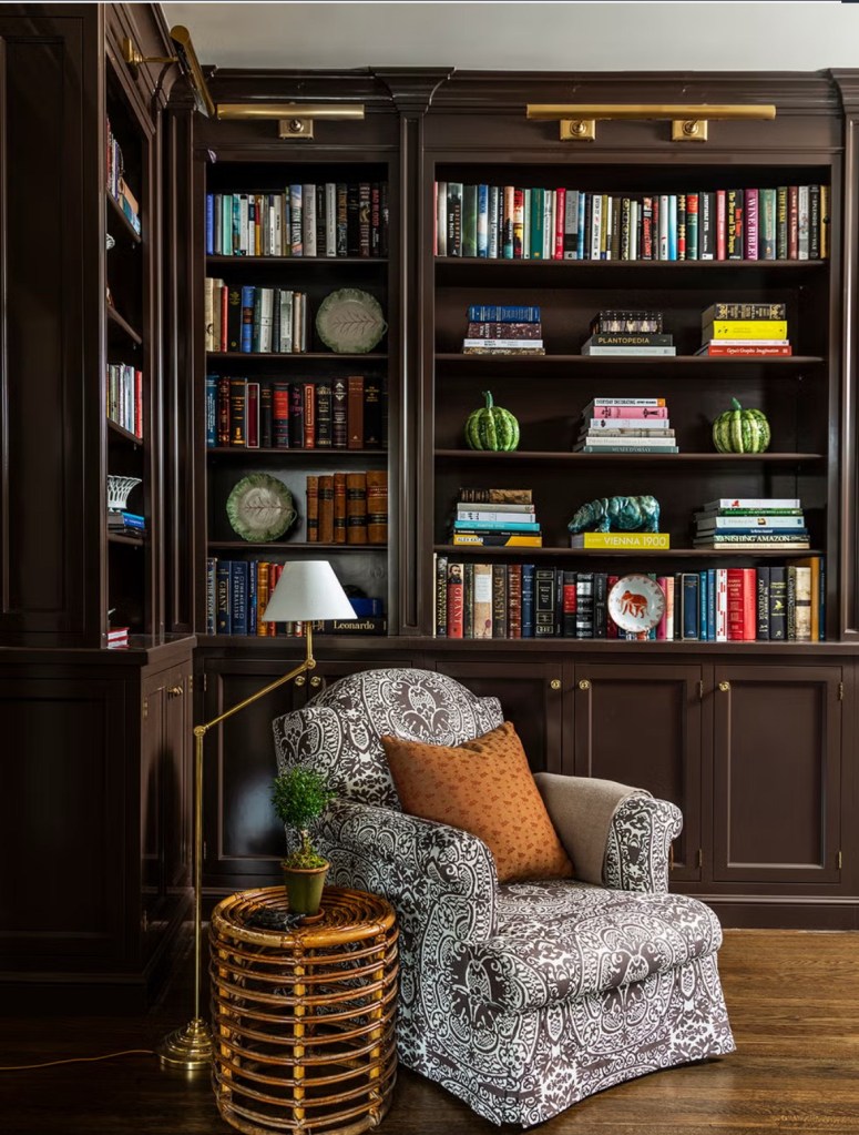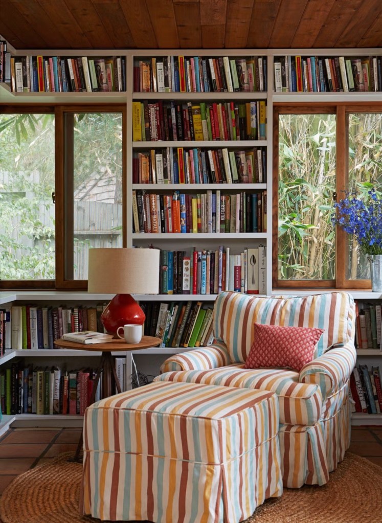 Oh, this is a fun prompt! I love reading, and I have a couple favorite spots at home where I usually read, but neither is a dedicated book space. So I had fun today, looking online for ideas. I’m excited to share what inspired me or caught my eye.