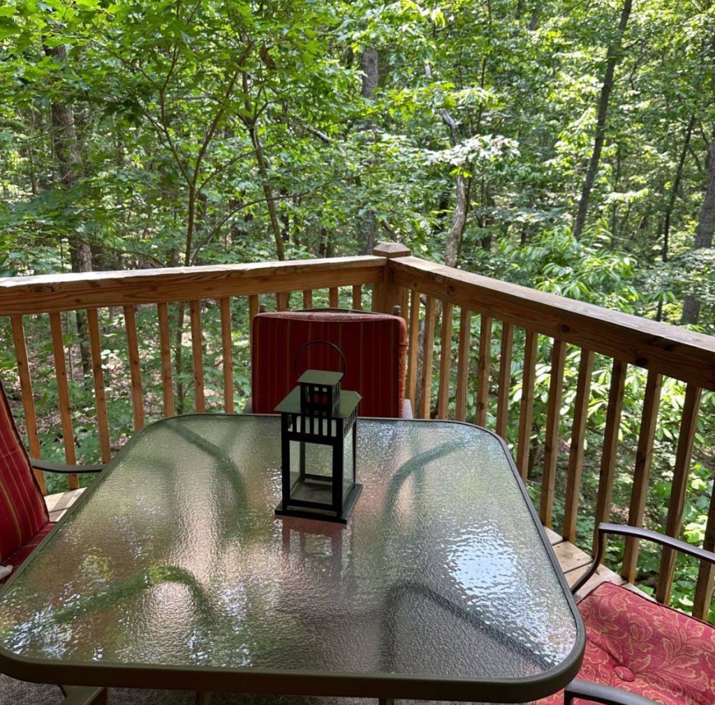 I love to read outdoors, even though it’s not always practical, and it certainly isn’t a place to keep books. Twice, though, we have stayed in a little cabin in the north Georgia mountains, and I spent as much time as I could on the deck, reading. The cabin is built into the side of the mountain, so the deck is in the tree canopy. So I was drawn to this library with a view.
