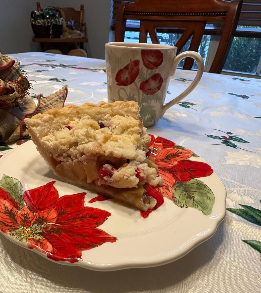 The day started with our traditional Christmas morning apple-cranberry pie. I lit the candle in the centerpiece and served on Christmas plates that I bought a few years ago, and it was a sugary and delicious start to the day.