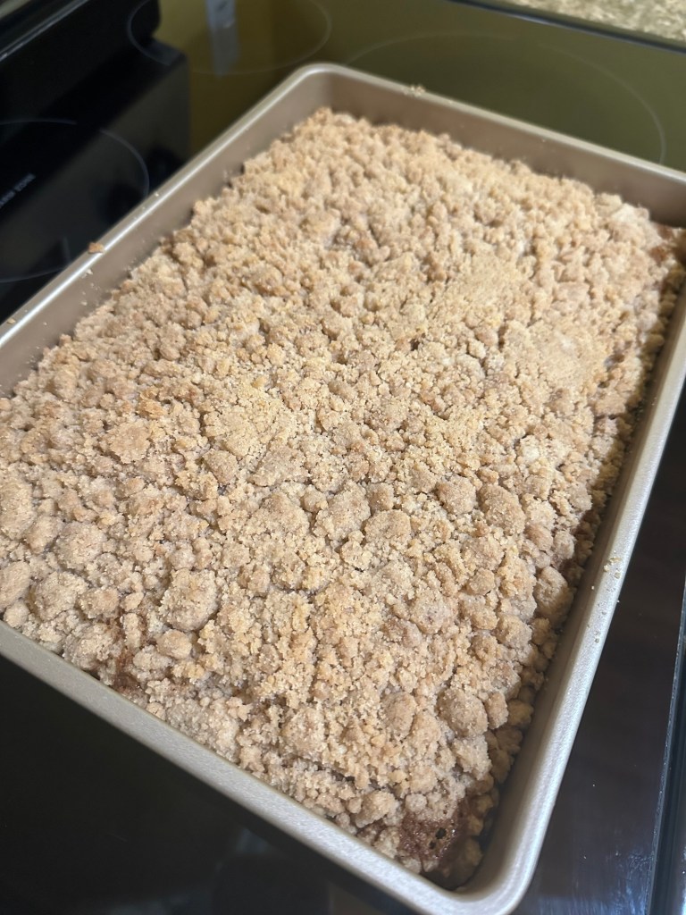 The only fly in the ointment was our finicky oven. We had to replace our range during Covid, when supply chain issues limited what was available. I wasn’t able to get the stove I wanted, and the one we ended up with has been something of a lemon. The oven takes forever to come to the desired temperature and doesn’t always maintain it. So when I checked the crumb cake st what was supposed to be the end of its baking time, the middle was still raw. I fussed and fumed, returned it to the oven, and baked it for what turned out to be another 30 minutes or so. Before I put the loaf in the oven, which I was baking second, I set the temperature 10 degrees higher than what the recipe called for. That seemed to do the trick.
