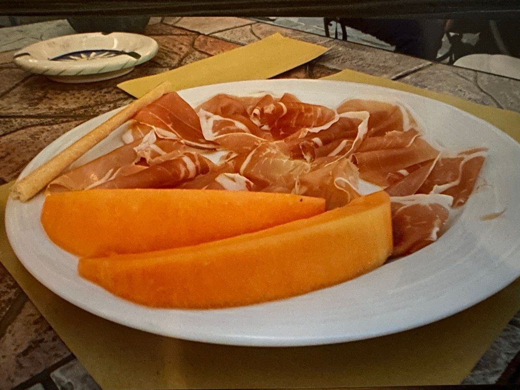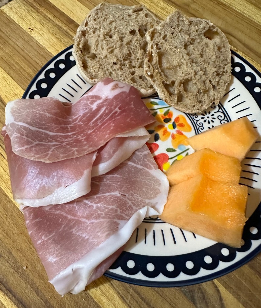 Prosciutto and melon has become a favorite breakfast, and Ken grinned when I set a plate of it, along with a toasted whole grain English muffin, in front of him this morning. We’d never considered eating it for breakfast before our trip to Italy in 2013, but both prosciutto and various kinds of melon appeared on the breakfast buffet daily, and we discovered that it’s a great morning combo.