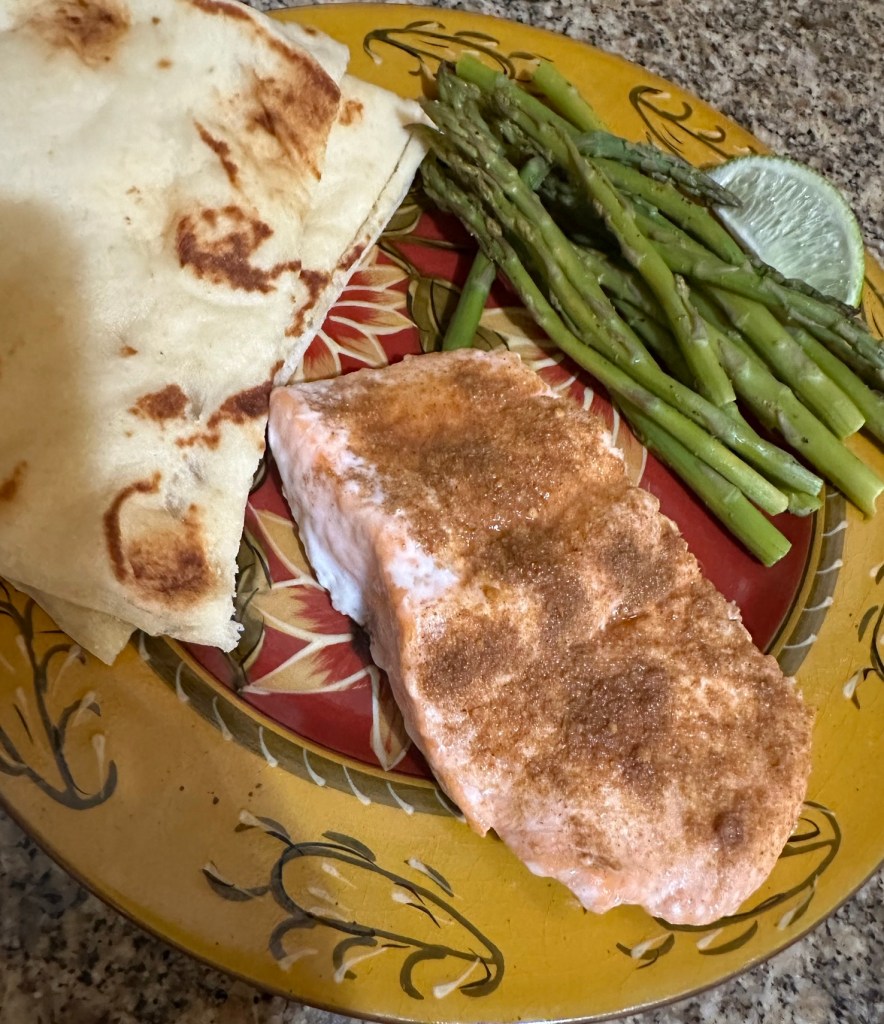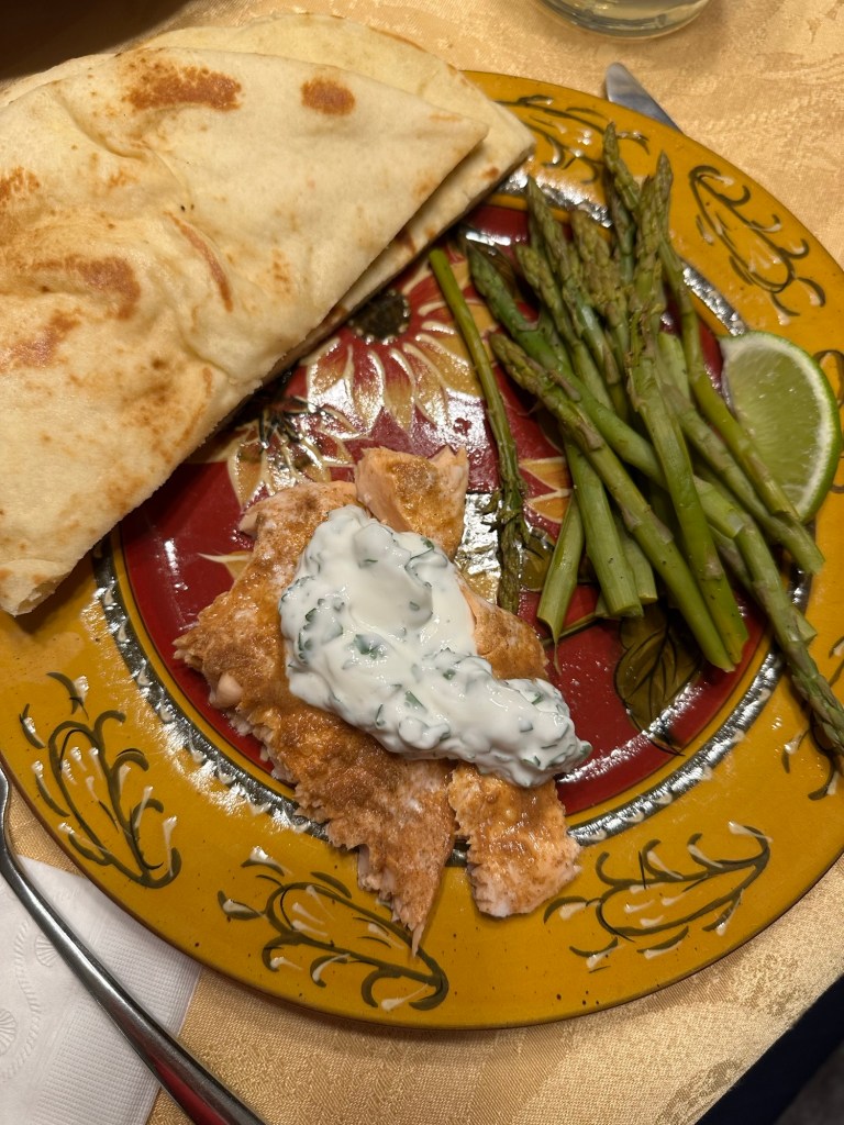 The dish is incredibly easy. I mixed up the spices, then squeezed lime juice over the salmon fillet and dusted it with the spice mixture. The recipe doesn’t call for the salmon to be skinned, but we always request it when we buy it. My trick to keep the fish moist, which I found in a newspaper interview with the owner of one of Miami’s seafood restaurants, is to add a couple tablespoons of water to the bottom of the baking dish—not on the fish, but around it, and it doesn’t need more than two or three tablespoons. While it was in the oven, I made the simple sauce of plain yogurt and chopped fresh cilantro. What could be easier? As I mixed the yogurt and cilantro, I thought that perhaps I should have made my cucumber raita, but we agreed that probably would have overwhelmed the salmon. Next time, I will make an Indian side, but we had some beautiful, thin asparagus that I steamed and seasoned with Penzey’s lemon pepper seasoning, and accompanied dinner with warm naan. It was a relaxing meal on a cool evening, accompanied by a glass of the Chardonnay from the Italian Piedmont that we love.