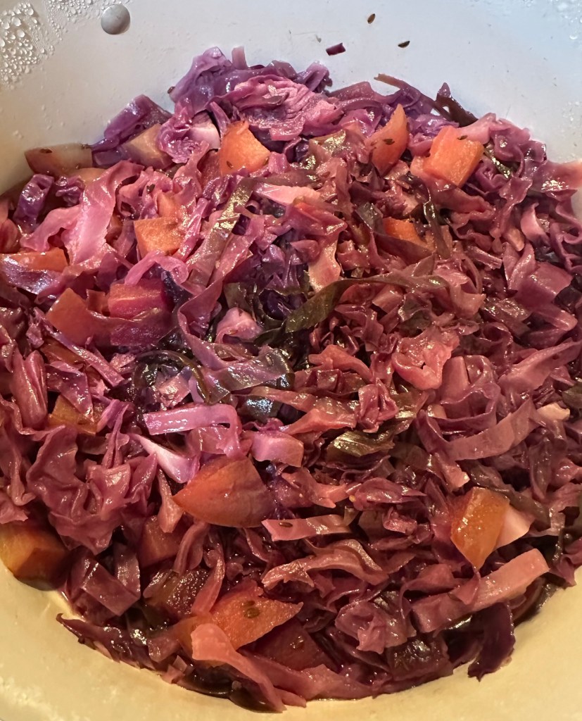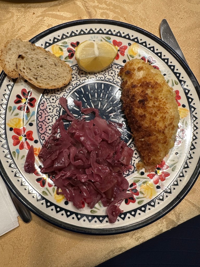So our dinner this evening was our favorite chicken schnitzel, rotkohl, and rye bread. I’ve posted the schnitzel recipe before, but I didn’t include the cabbage recipe. That’s what I’m including today.
