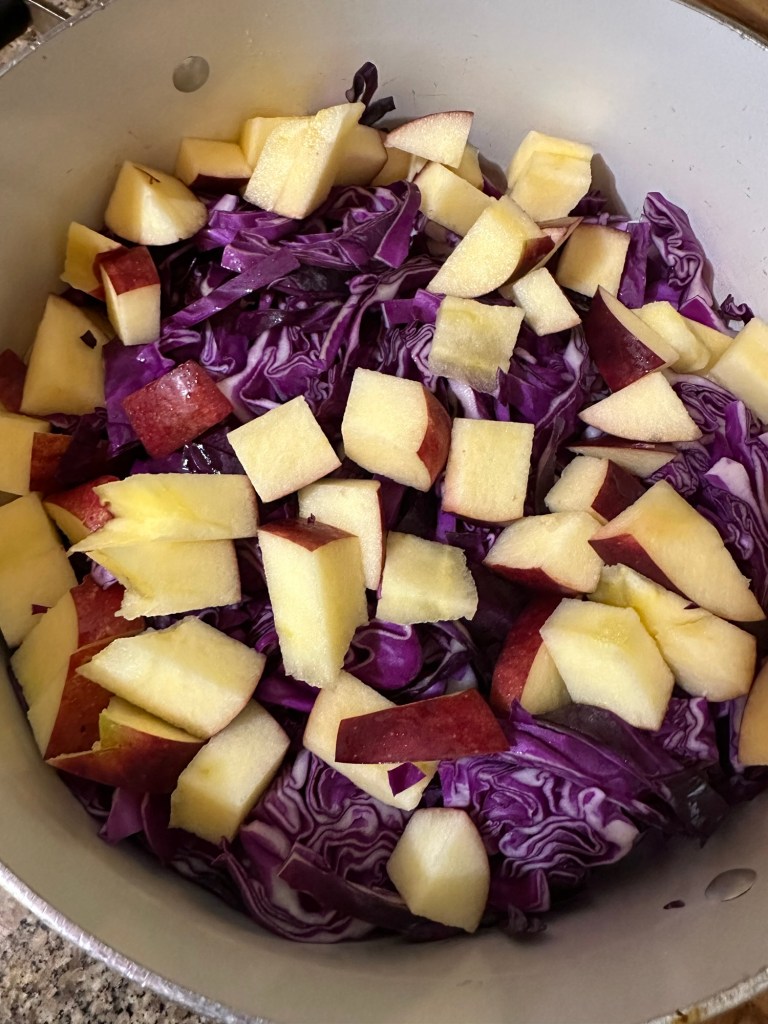 I’ve made this dish so often that I don’t need to look at the recipe. Nonetheless, I originally found it in one of first cookbooks I owned, America Cooks. This was a compilation of recipes from the Federation of American Women’s Clubs, edited by Anne Seranne, and published in 1967. I initially had an abridged paperback version that I bought a month or two after we were married. Within a couple of years, I had used it so much that it was falling apart, so I ordered the complete hardcover edition. Today that copy is held together with duct tape. It is a great general cookbook with tons of sound, timeless advice. Seranne was a respected cookbook author who also served as an editor of Gourmet magazine. The book is just a great resource. In the cookbook, the recipe is called Grandma’s Red Cabbage, but everyone in the family refers to it by the German rotkohl. When your kids ask you to cook cabbage, you know you’re doing something right.