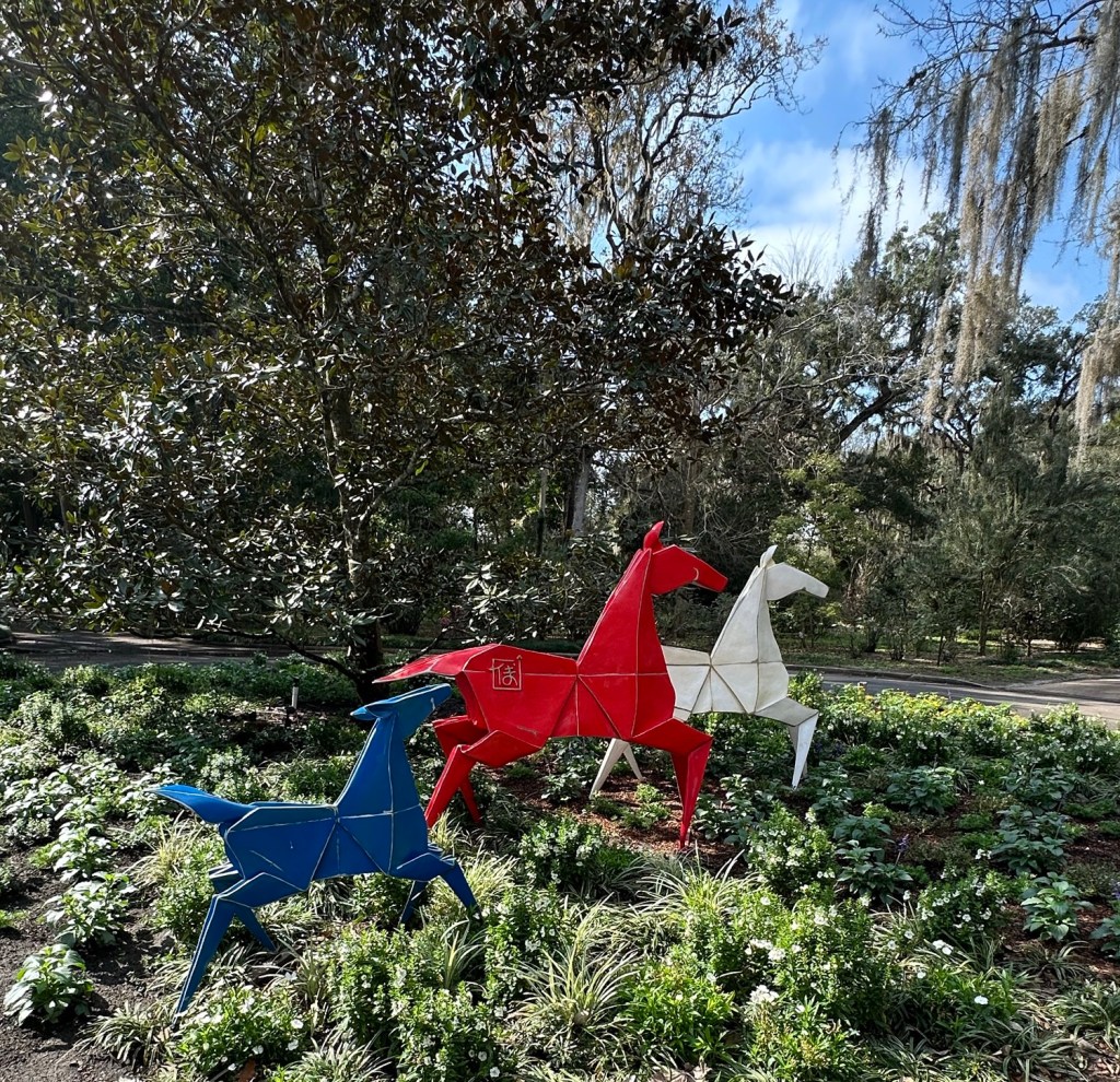This morning, Ken and I visited Leu Gardens, the botanical garden in Orlando. We love visiting botanical gardens when we travel, and we’ve been to Leu Gardens numerous times. We wanted to go because the camellias are in bloom. Camellias don’t grow in South Florida, so it’s always a treat to see them here. A bonus was the fact that the art installation Origami in the Garden just opened this week. These statues had been At Mounts Botanical Garden, where I volunteer, last winter, so I had seen them. But that was when Ken was dealing with the medical issue, so this was his first opportunity to see it.