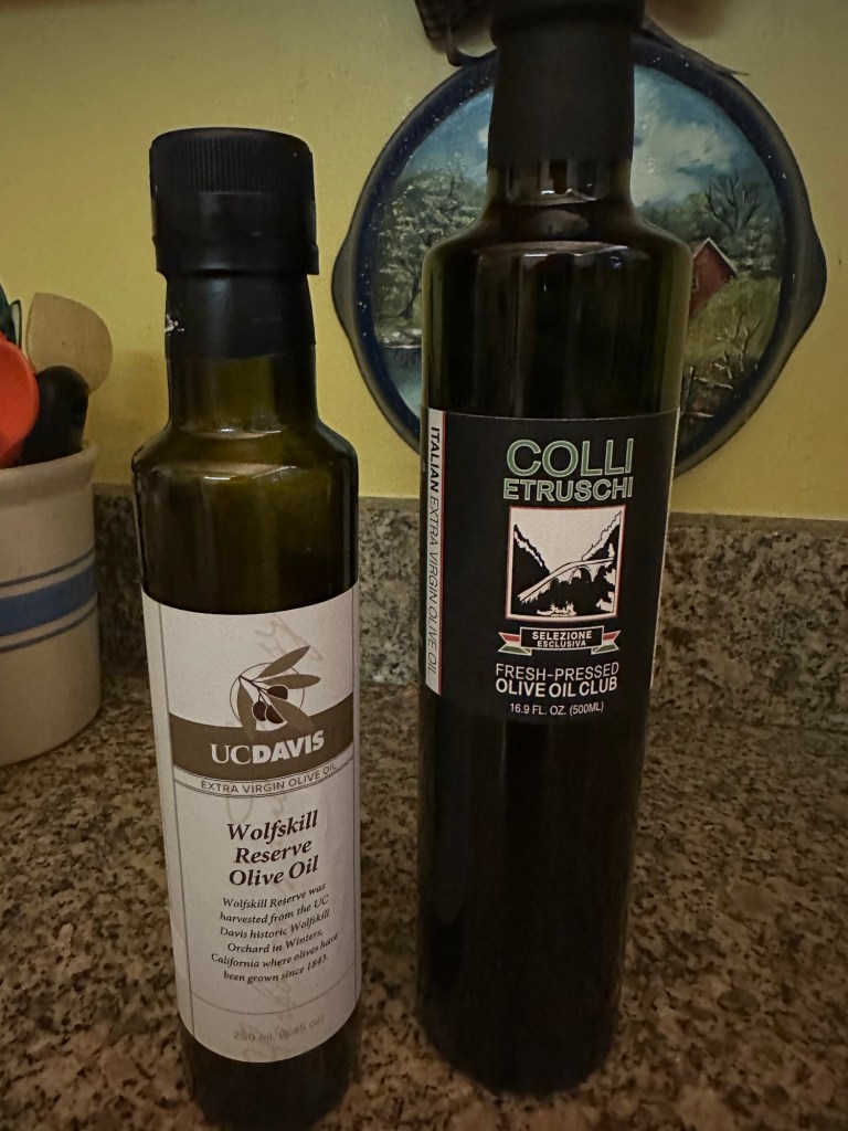 In addition to this olive oil, I also have my “good” oil. This is my finishing oil that gets added at the end of cooking, or gets dribbled over salad, along with some vinegar or lemon juice. Currently, I have two of these oils: one of the oils from the University of California, Davis olive center, and a fresh-pressed oil from Italy that was a Christmas gift from Ben.