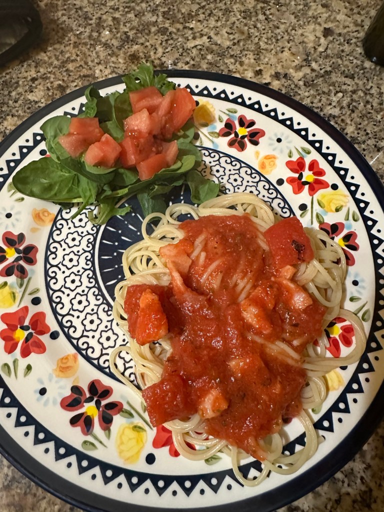 These days, I don’t even look at the recipe or measure anything. I cut three strips of thick-cut applewood smoked bacon into 1/2-inch pieces. I heat a teaspoon of olive oil in a large saucepan, then add the bacon and 4 coarsely chopped cloves of garlic. When the bacon is cooked but not browned, I add a 28-ounce can of crushed tomatoes, a can of drained fire-roasted diced tomatoes, probably about a teaspoon or dried marjoram, and a half teaspoon of ground black pepper. I don’t add salt at that point; usually there’s enough salt from the bacon. I let it simmer while I cook a pound of spaghetti. I adjust the seasoning, if necessary, and serve with grated Parmesan. It will serve 4 to 6.