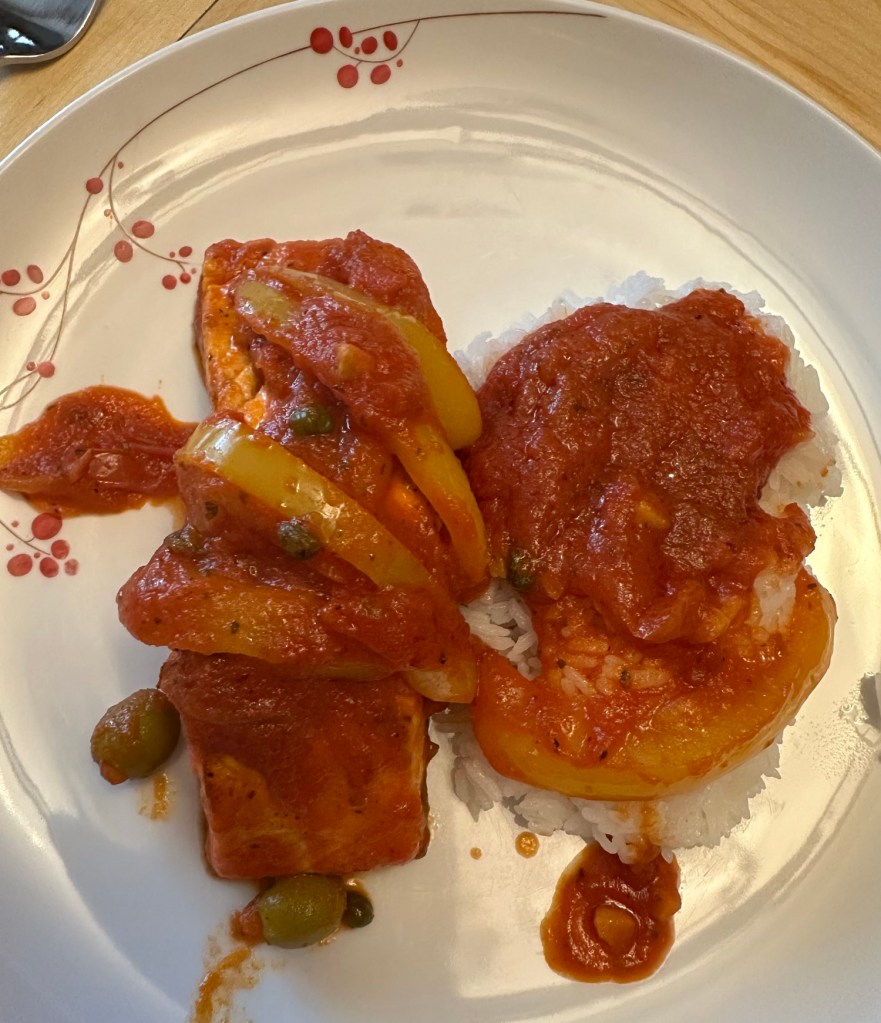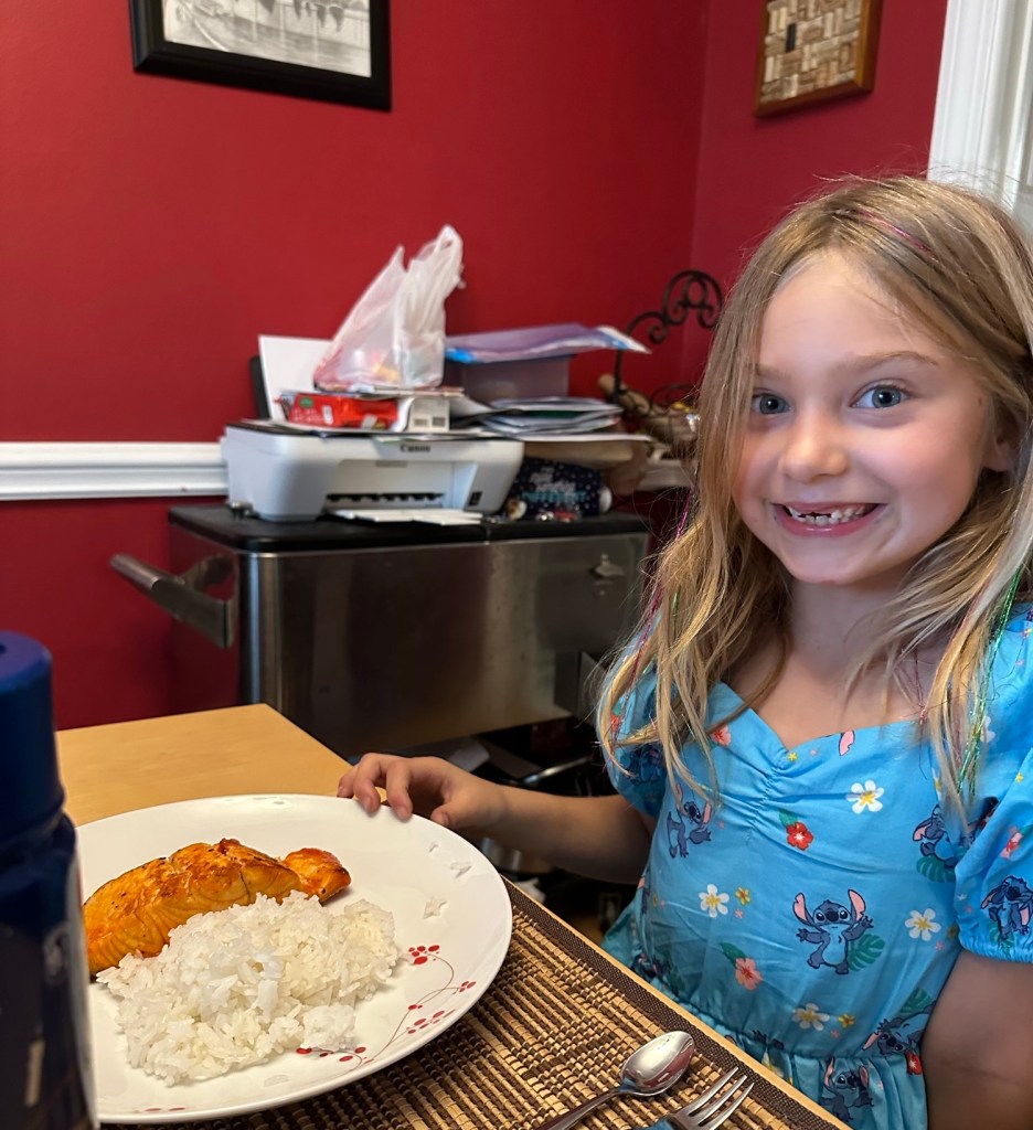 I have made fish Veracruz for years, always with some sort of white fish. Ben did a version with salmon, which was delicious. He used a recipe that he originally made with white fish, but Emmalyn is a salmon lover. She didn’t really care for the original version, so he tried it with salmon. The combination worked perfectly. He served it with mounds of rice, and we really didn’t need anything else. Ken and enjoyed extra sauce over our fish and rice; Emmalyn was all about the salmon. Ben refused our offers to help with cleanup, so we had more time to spend with Emmalyn. Definitely a fun evening.