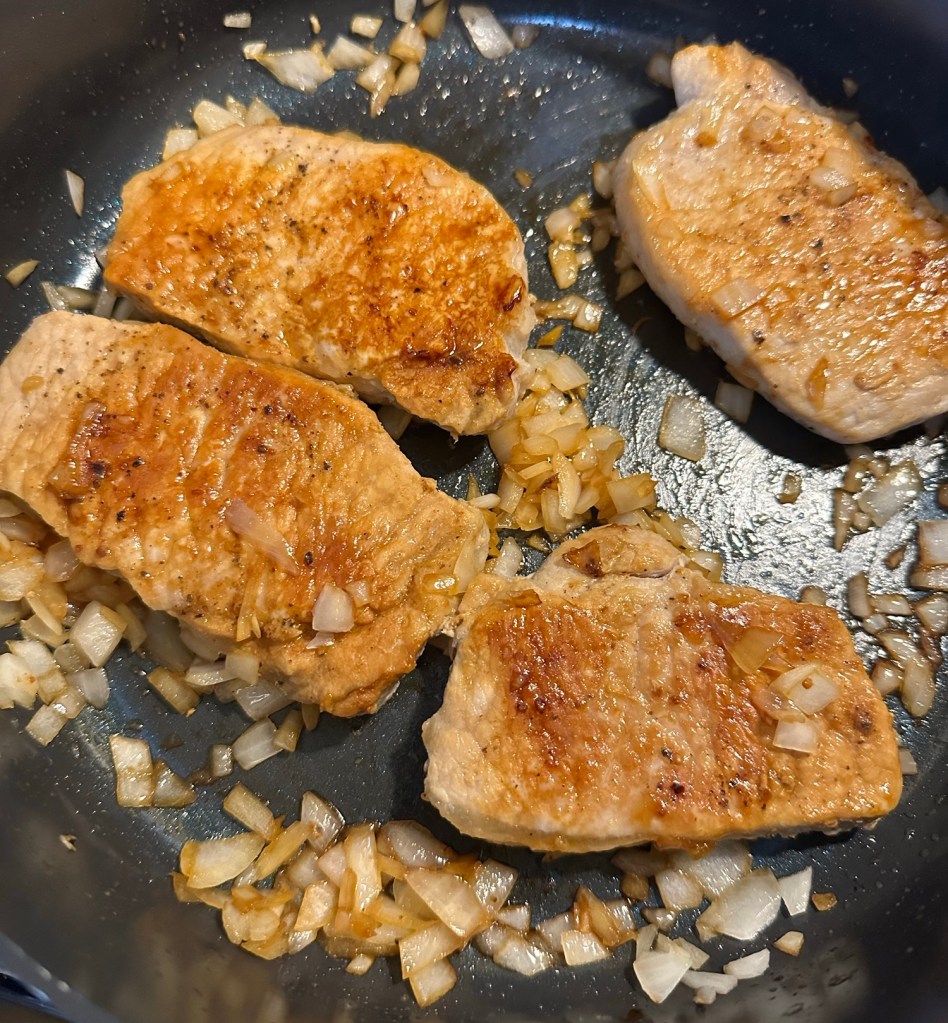 In terms of 30-minute cooking, I cheated. I chopped the onion and pickles earlier in the afternoon. After all, it was baseball opening day, and the Phillies’ game didn’t start until 4:05. That meant frequent trips from kitchen to family room whenever it sounded as if something important had happened. But overall, the dish was as easy as I remembered. I simply browned the chops in a little bit of olive oil, then covered them and let them cook for about 15 minutes. (I ended up draining the fat at that point, something I’d never had to do before. The chops looked very lean when we bought them, but I guess I was wrong.) The recipe then calls for adding the chopped onion and cooking another five minutes, after which you add the remaining ingredients for the sauce and let it heat through. After I added those ingredients, I remembered that, every time I’d made this before, at that point I would say, “next time, I’m taking the chops out of the pan to mix the sauce ingredients”, but always forgot. I’ve written it on the recipe for next time 😄