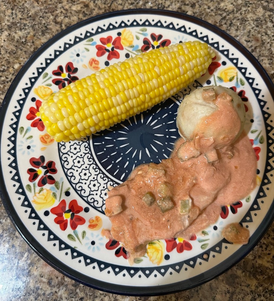 I’ve always served the chops with noodles, which are perfect with the sauce. However, we still had a couple of dumplings from a package that Alice gave us, so we used those. I had planned to have a salad on the side, but it’s sweet corn season in Florida. We picked up a couple ears when we were at the market and had that instead.