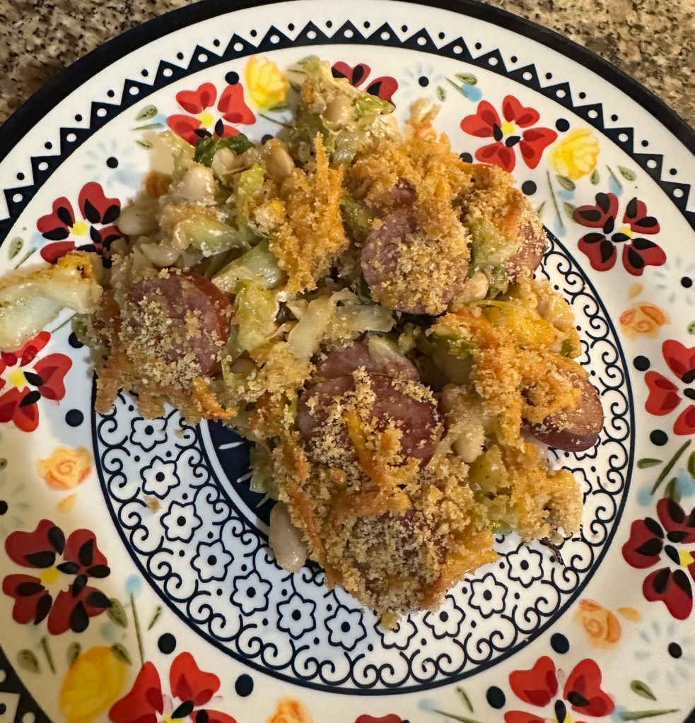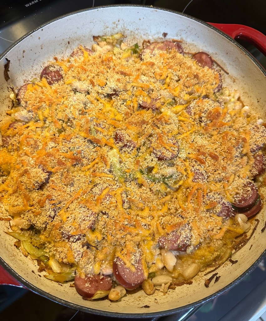 The result was, on the whole, a winner. We agreed that we’d prefer more greens to beans, so next time I’ll use the entire head of cabbage (assuming I can find another nice, small head like I did this time). Ken suggested that the topping could do with less breadcrumbs and more cheese, and I agree. But everything else worked out well. The seasoning was spot on. I used my cast iron skillet to go from stovetop to oven, so it was a one pot meal and easy cleanup, which is always a bonus. And I feel like I definitely put my stamp on this dish. I’m presenting the recipe the way I will make it next time. If you want to lay down a different culinary line with this as a guide, go for it!