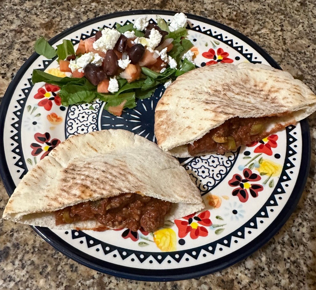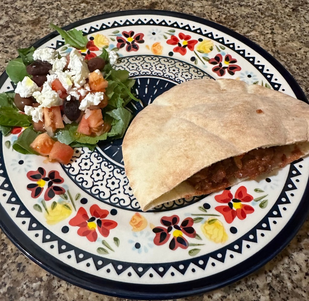 I’m guessing that he got the idea to serve the meat in pita pockets from the cookbook, and that was a great idea, along with my Greek chopped salad. This is a salad I copied from a gyro place in town: chopped romaine, tomato, and onion, plus Kalamata olives and crumbled feta, dressed with olive oil and lemon juice—except that I used the excellent calamansi vinegar that we have in place of the lemon juice. It’s definitely a “keeper,” and I will try to write down a more accurate recipe the next time Ken makes this. I hope it’s soon.