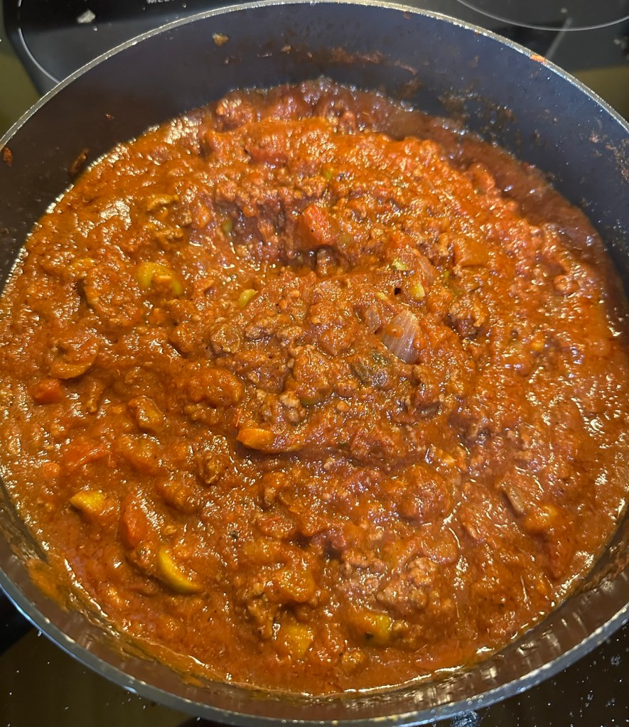 You may remember that I wrote about picadillo in my post Cuban Comfort Food. The similarities between the dishes are many. Both involve ground meat in a tomato sauce with chopped onions, garlic, and bell peppers. And both include olives. While I leave the olives whole in my Cuban picadillo, Ken chopped his. He also soaked golden raisins in water, and added them to the mix. His sauce had a deeper tomato flavor, as he used a 28-ounce can of crushed tomatoes plus a few tablespoons of tomato paste. It initially looked like a lot of sauce for one pound of meat (Ken used ground beef, but ground lamb would be wonderful cooked this way), but he cooked it uncovered at what I would describe as a hard simmer for about 20 minutes before covering the pan and reducing the heat.