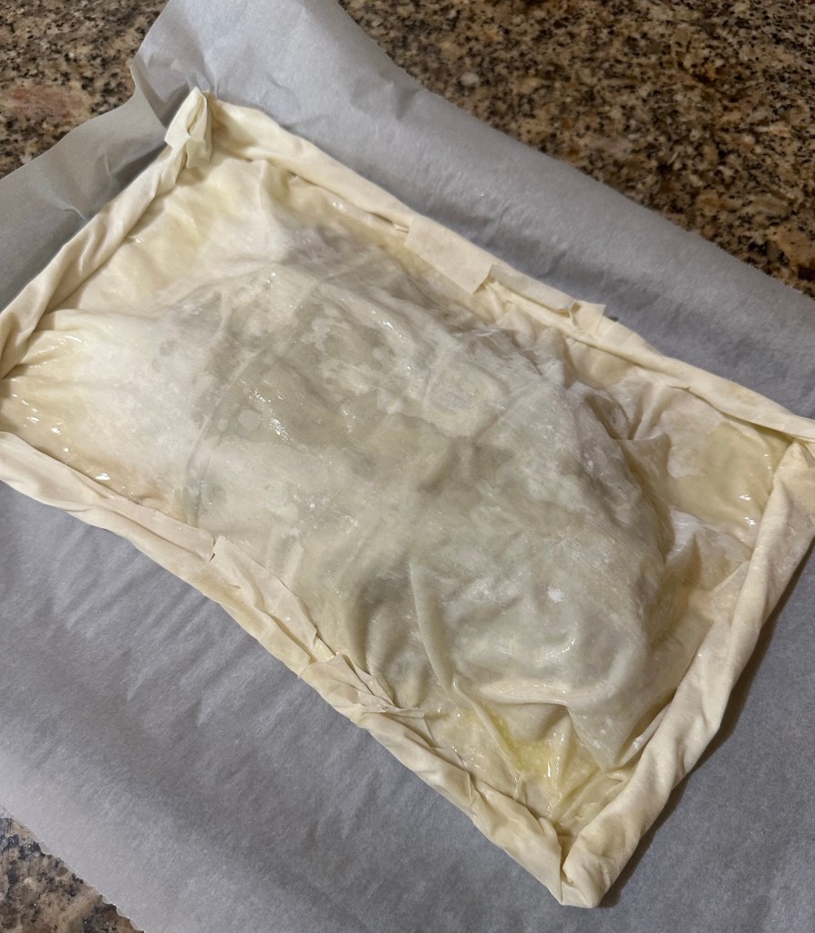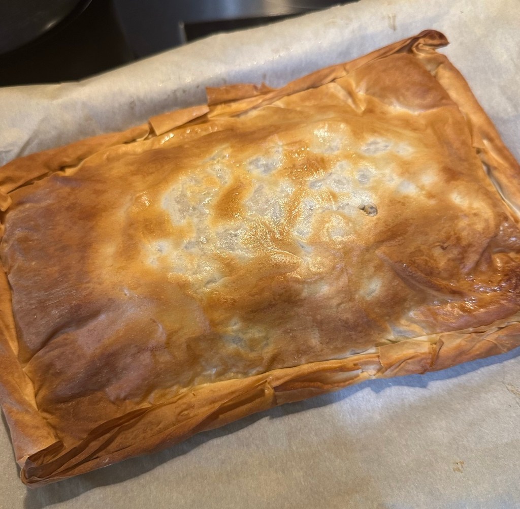 The original recipe was to serve 8; I’ve cut it in half, so it feeds 3 to 4. The other change is probably not Weight Watchers approved. The recipe called for spraying the phyllo layers with cooking spray, and I did that the first time I tried the recipe. But the phyllo tasted off. I tried brushing the sheets with melted butter, and it was such an improvement, I’ve never gone back.
