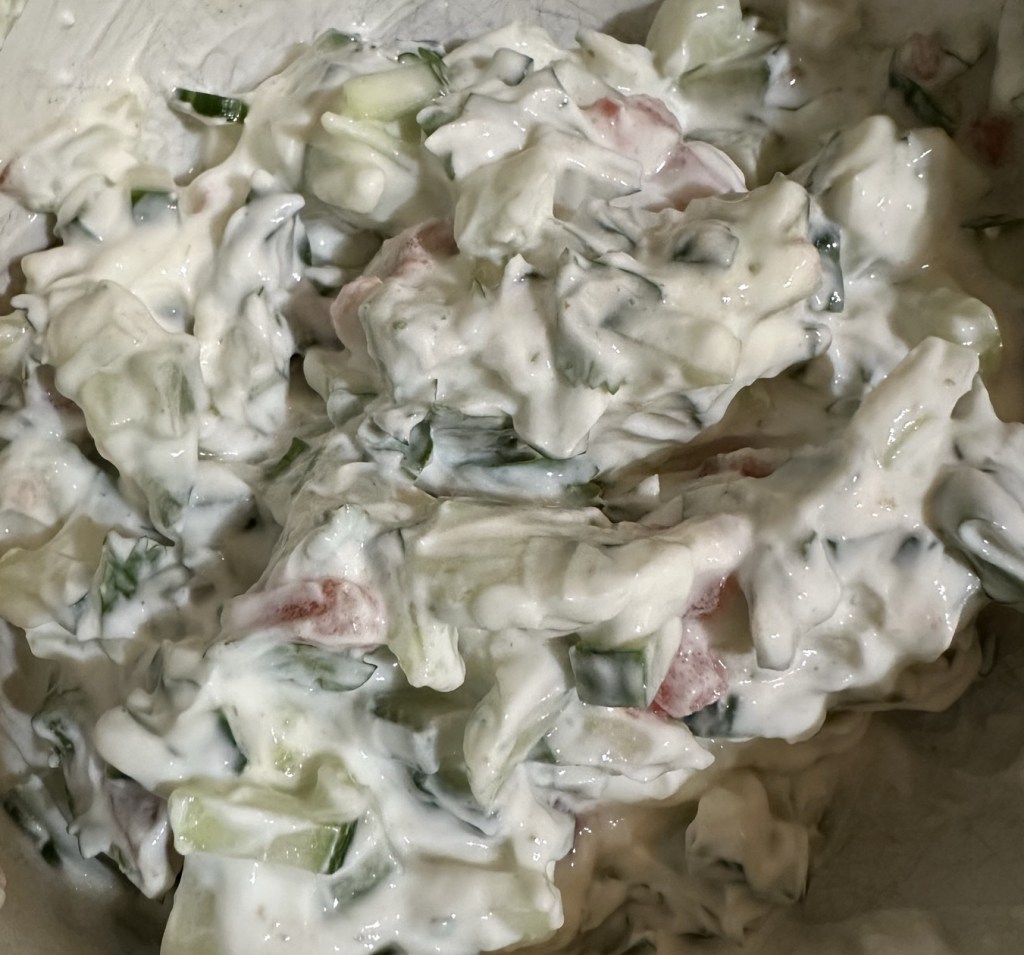 I always serve this over rice, and often make a cucumber and tomato raita, as I did last evening. It was the perfect side on a hot day. It definitely felt good to be cooking again.
