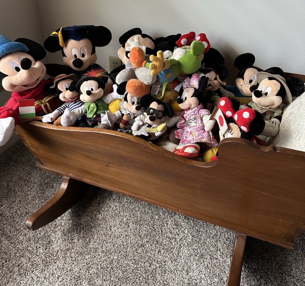 A collection that is very precious to me is the one of stuffed Mickey and Minnie Mouse characters that were gifts from students. For many years, I would take a choir to perform at Disney World. As an appreciation gift for the business we brought, the hotel where we stayed gave me a stuffed Mickey Mouse. When I put him in my classroom, he inspired students to bring me other versions. I think I have all of the Mickeys and Minnie’s designed for the different countries represented at Epcot. There’s a black and white Mickey, a guitar-playing Mickey Mouse, and many more. There was no doubt that they were coming home with me when I retired. They are much loved by our grandkids, which is why they never stay neatly arranged.
