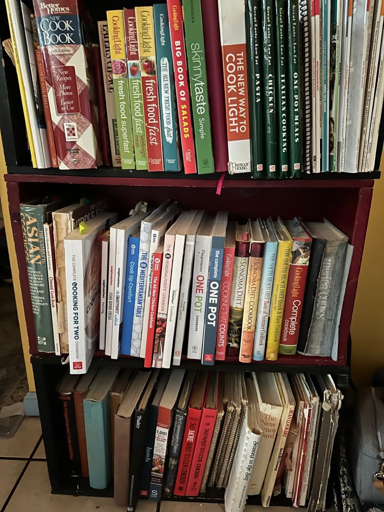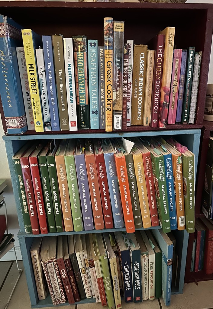 My cookbooks can legitimately be considered a collection. When we moved into this house 36 years ago, all of my cookbooks fit into the bookcase shown above, which is adjacent to the kitchen in an area that I think was intended as a breakfast nook; we made it a mini-office. But the collection grew, and now it fills another three shelves in the family room bookcase. I’m not supposed to buy another cookbook without getting rid of one. Gifts don’t count, though, and I think I’m still owed a couple from when I gave away many of my Southern Living annual recipe compilations.