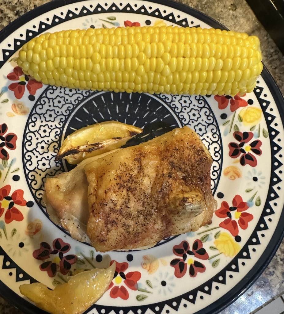 Until last evening, my cooking this week has been kind of limited. Ken cooked on Tuesday, making his Romanian meatballs, which are always good, but even better the second day. Thursday, although he entree was a simple baked chicken with lemon and garlic that is a standard dish around here, the star of the meal was corn on the cob.