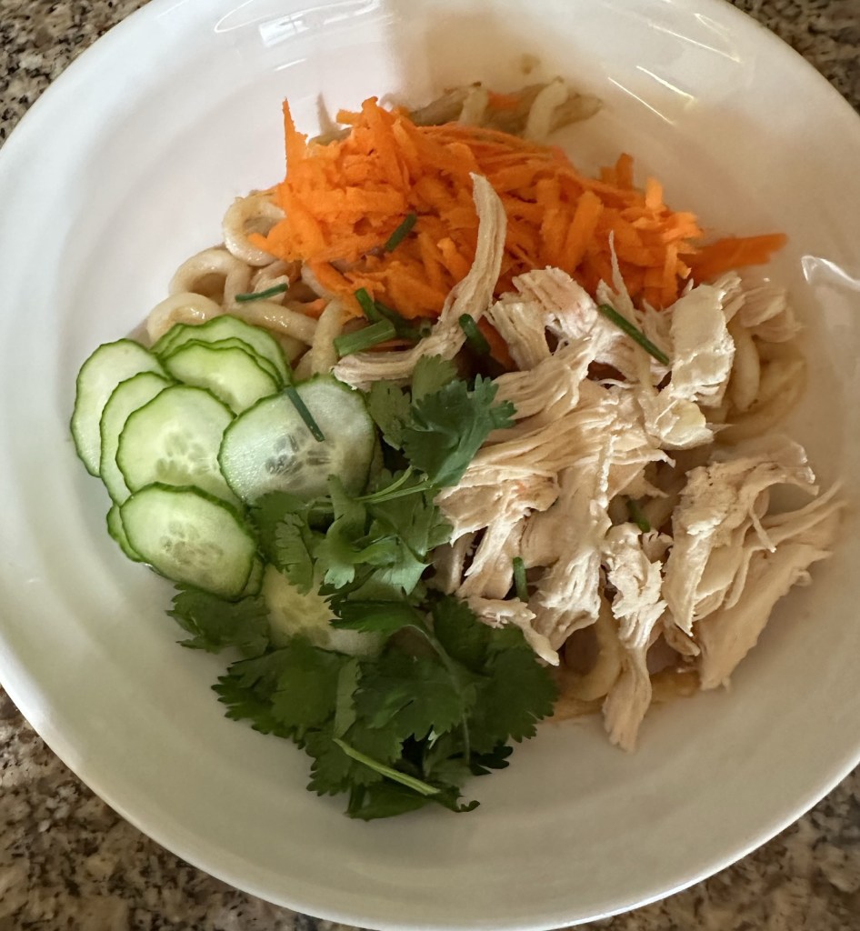 The original recipe calls for making a peanut-sesame sauce and mixing some of it with the noodles as the base. The authors top the noodles with shredded cooked chicken, shredded red cabbage, fresh cilantro leaves, and chopped peanuts. We ditched the cabbage and replaced it with shredded carrots and cucumber slices. We also followed the family rule of “no nuts in food,” and skipped the peanuts. I had some chives in the fridge, so I chopped some to sprinkle on top. We drizzled more peanut-sesame sauce over top; that’s the real star of the dish. The recipe calls for serving the bowls with lime wedges, and we had limes, but I forgot. I think the lime juice would really kick it up a notch.