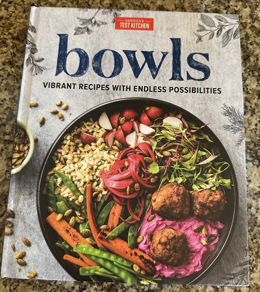 I bought America’s Test Kitchen’s Bowls cookbook last winter. We had met with the nutritionist who worked with the practice where Ken went for physical therapy, and I was looking for sources for either plant-based recipes or those that use a smaller amount of meat/poultry. Bowls seemed to be a good option. (Actually, what we learned from the exercise is that our diet was pretty healthy to begin with. The changes we tried didn’t seem to have any effect on Ken’s condition, and eating foods he enjoyed helped his mental outlook). But, although I saw lots of interesting recipes, the cookbook ended up on the shelf, unused.