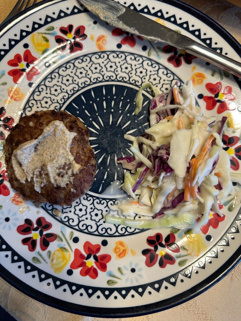 Ken suggested a Cooking Light recipe we’ve made once before that we enjoyed: turkey bratwurst patties. It simply combines lean ground turkey with traditional bratwurst spices. If we weren’t leaving tomorrow, warm German potato salad would have been the ideal side. Instead, I’m using up the bag of coleslaw mix I used in the Buffalo chicken bowls to make coleslaw.