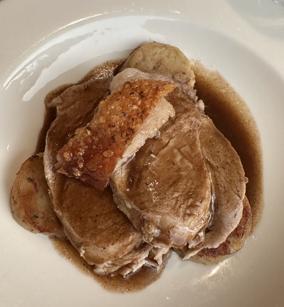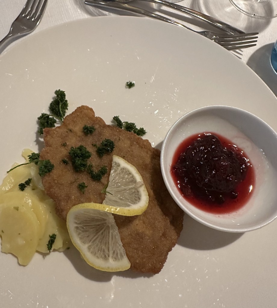 Although there are always fish and vegetarian options on the menu, the real stars are the meat dishes. Wednesday evening was the “taste of Austria” sampling dinner, and the chef joked before the meal that, if you’re vegetarian, tough luck. (Actually, they had an off-menu vegetarian option, and there was a fish dish also, but he referred to that as “an afterthought.”)