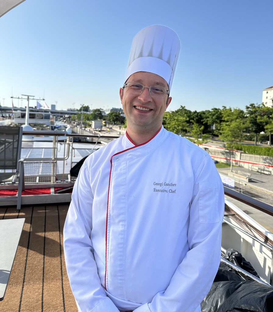 The roast pork on Monday evening, as well as the beef roast on Tuesday, was fork tender. The pork was served over potato dumplings, the beef over mashed potatoes. This is comfort cooking at its best. The sampling buffet last night included delicious sauerbraten, one of my favorite ways to cook beef. Paired with sauerkraut and spaetzle, I felt as if I was back in my Pennsylvania Dutch childhood. But I also tasted two different sausages, pickled beets, cucumbers—well, let’s just say that it was a lot of food. Ken and I took a few minutes to walk on the top deck after breakfast this morning, where we met the chef enjoying his coffee. He said the fine print in our booking agreement absolves him from responsibility for any excess pounds!