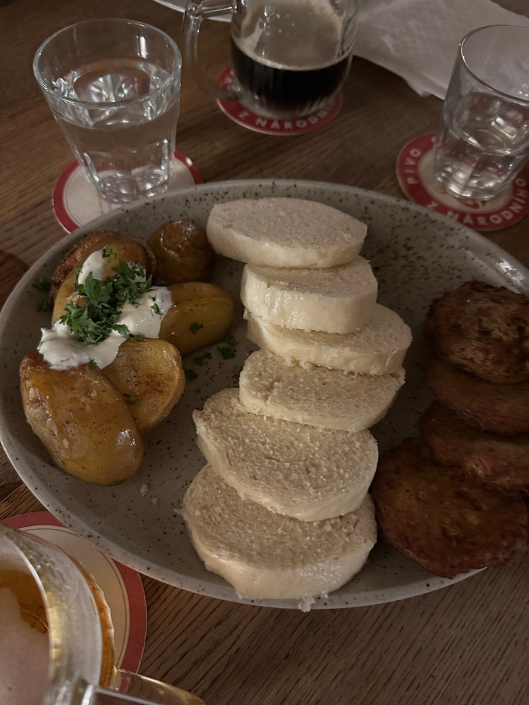 That one not-so-great meal? That was the lunch that was included in our excursion to Cesky Krumlov. Our group had lunch at a quaint restaurant on the old town square; it had the feeling of being in a cellar. We started with Budvar beer on draft: the “real” Budweiser, brewed in Cesky Budjovice. For many years, Anheuser-Busch kept the beer from being imported to the US. Now, it’s available, but under the name Czechvar. The beer was a great start, and we were all served an interesting soup that had the consistency of egg drop soup but was flavored with dill. Then things went downhill. The food was served family-style, and the servers brought out platters that contained boiled potatoes, bramboraky, or potato pancakes, and something that Ken and I were looking forward to, potato dumplings known as bramborovy knedlicky. But when the platter was set on our table, Ken turned to me and said, “where’s the gravy?” You don’t serve these dumplings without gravy! Someone in our group described them as tasting like Wonder Bread. Plus, the potato pancakes had been fried past crispy to hard rocks.