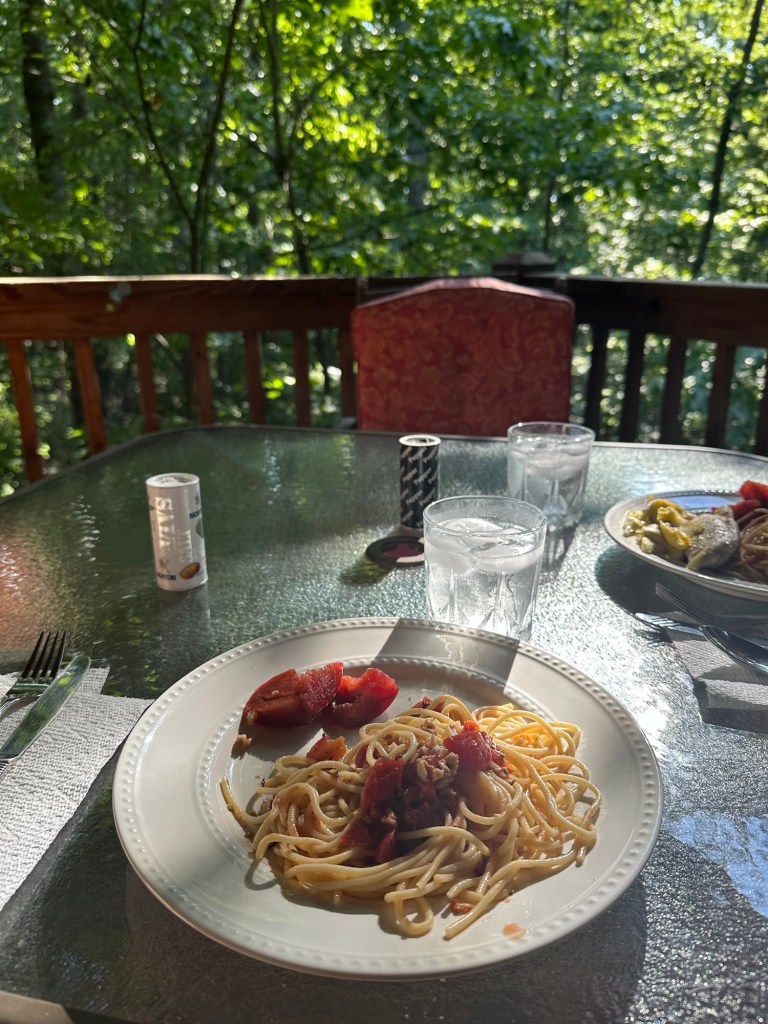 It has been an absolutely wonderful trip, and it’s going to be hard to leave here tomorrow. Tonight was one last glass of wine from the bottle we bought at Yonah Mountain Vineyards and one more dinner in the treetops, listening to the birds. Maybe we’ll see the doe that visited our driveway before we leave in the morning.