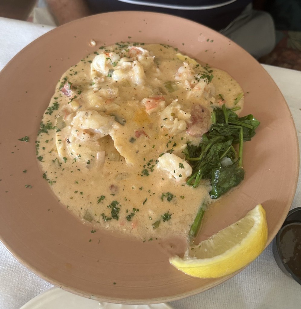 Ken ordered the lobster ravioli special. The ravioli were generously topped with shrimp and a rich cream sauce. Ken thought he detected clams in the sauce, as well. The taste of ravioli that I snagged was superb. Ken emptied the bread basket to sop up as much of the delicious sauce as he could.