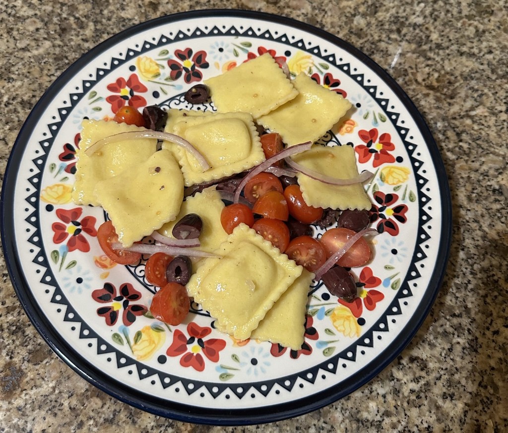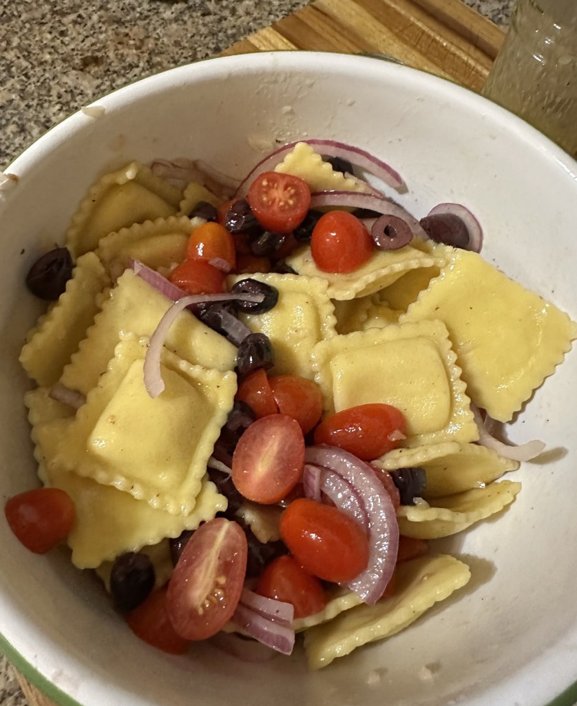 The dish is why I’m here, though, and it’s a wonderfully different take on a pasta salad. I don’t know why I should be surprised that ravioli work well in a salad. After all, I love tortellini salads, and what are they, really but a different shape of the same thing.