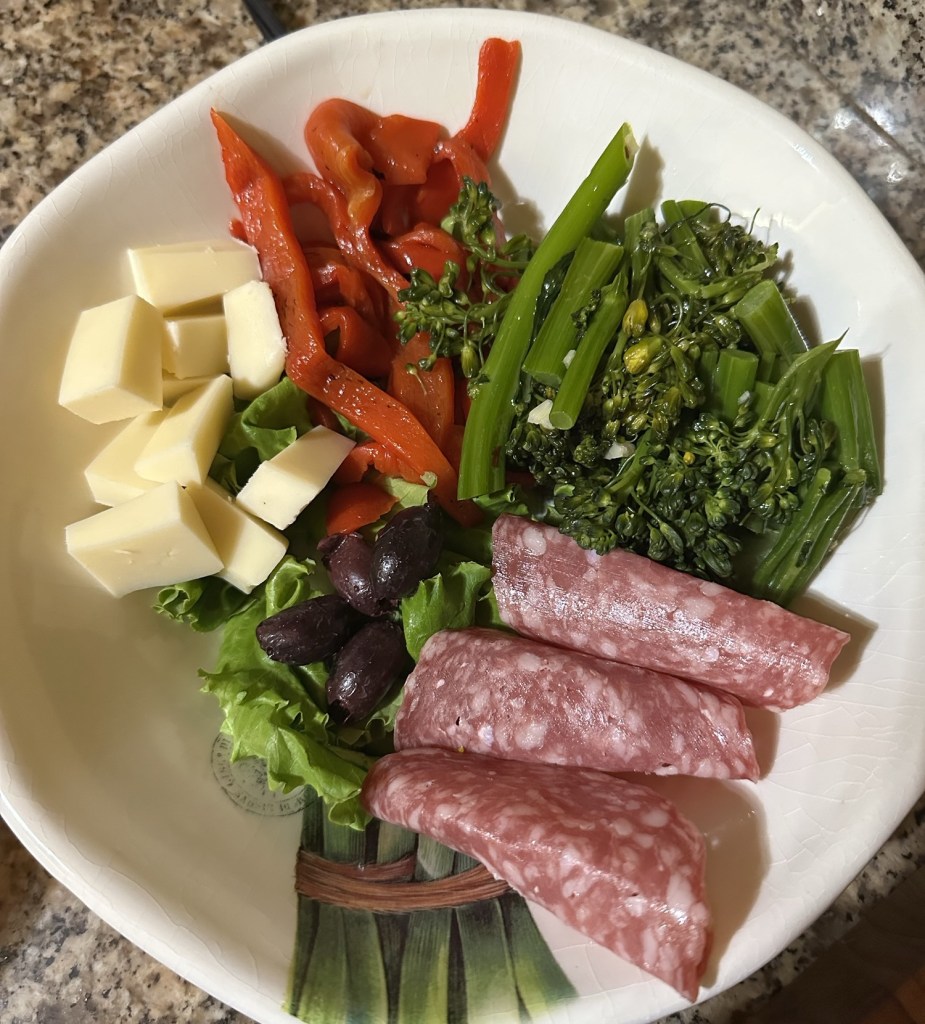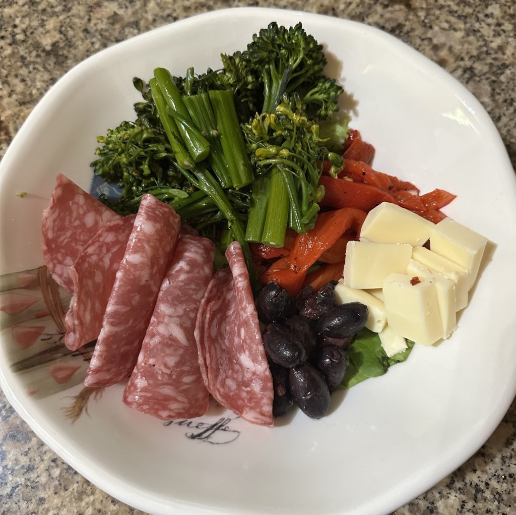 That’s a super-long lead up to an easy to assemble salad. The salami, cheese, bell pepper strips, broccolini, and olives went over a bed of baby lettuce, and we drizzled it with vinaigrette. Yum!