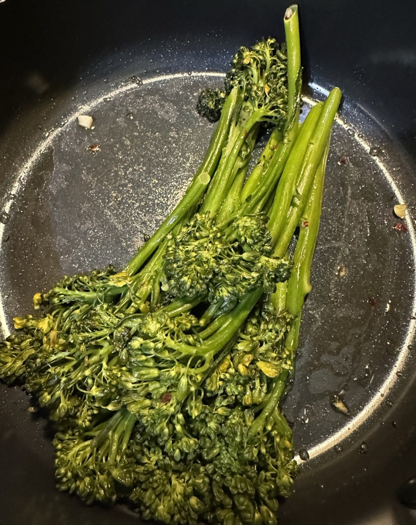 The biggest change I made was to substitute broccolini for broccoli rabe. I think I’ve only eaten broccoli rabe once, even though it’s a Philly thing. Ken doesn’t think he’s ever had it, and I know I’ve never cooked it. I might have given it a try, but I found broccolini on the same trip to Trader Joe’s, and it just seemed natural to substitute it, especially as it’s one of my favorite foods.