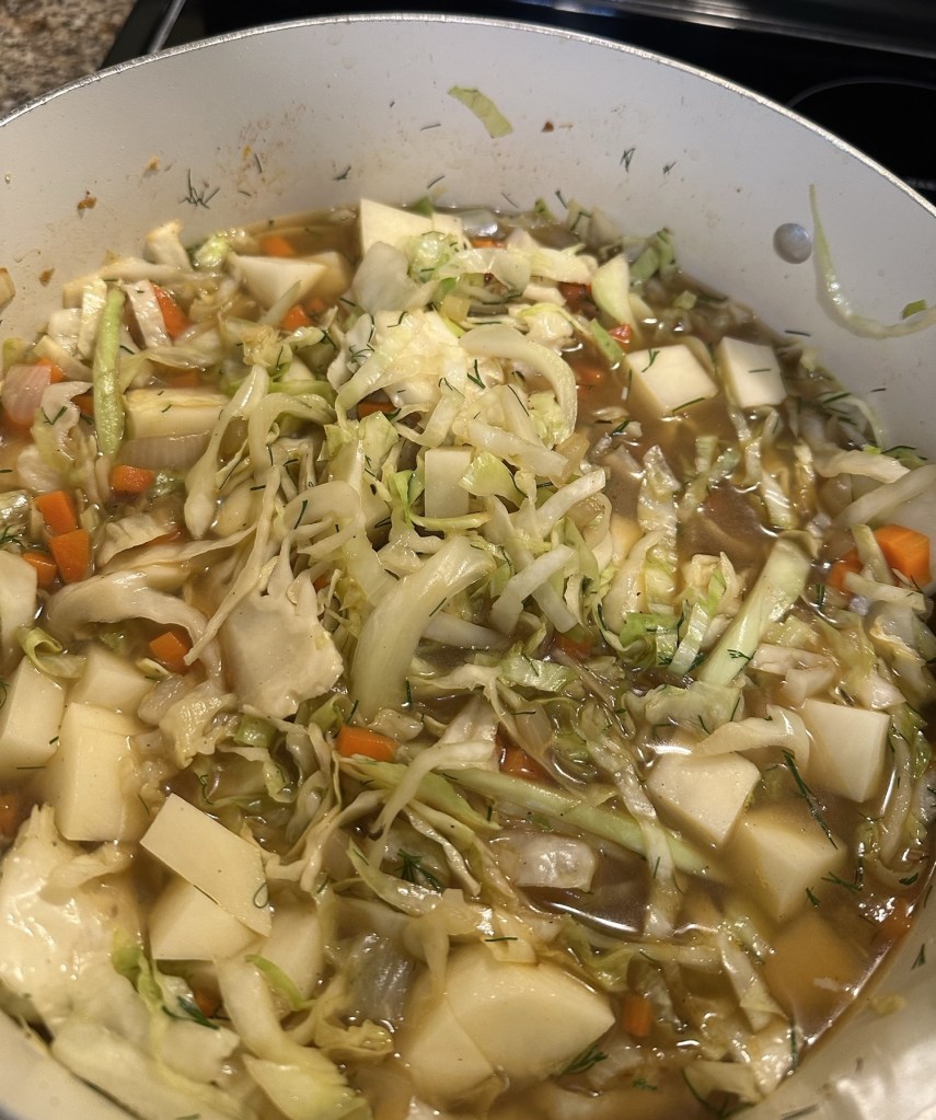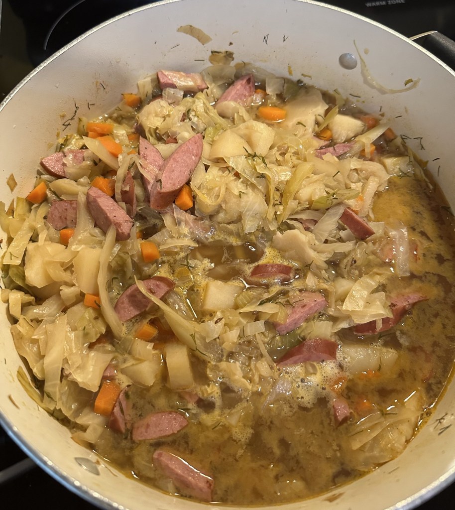 The two cabbage soup recipes that are included went to the top of the list immediately. I like cabbage, but I really love cabbage soup. It wasn’t a soup I remember eating as a kid. I think it’s something we were introduced to while living in the Czech Republic. All I know is that, when I saw the recipe for kielbasa and cabbage soup, it ticked all the boxes for me, and Ken was as enthusiastic about it as I was.